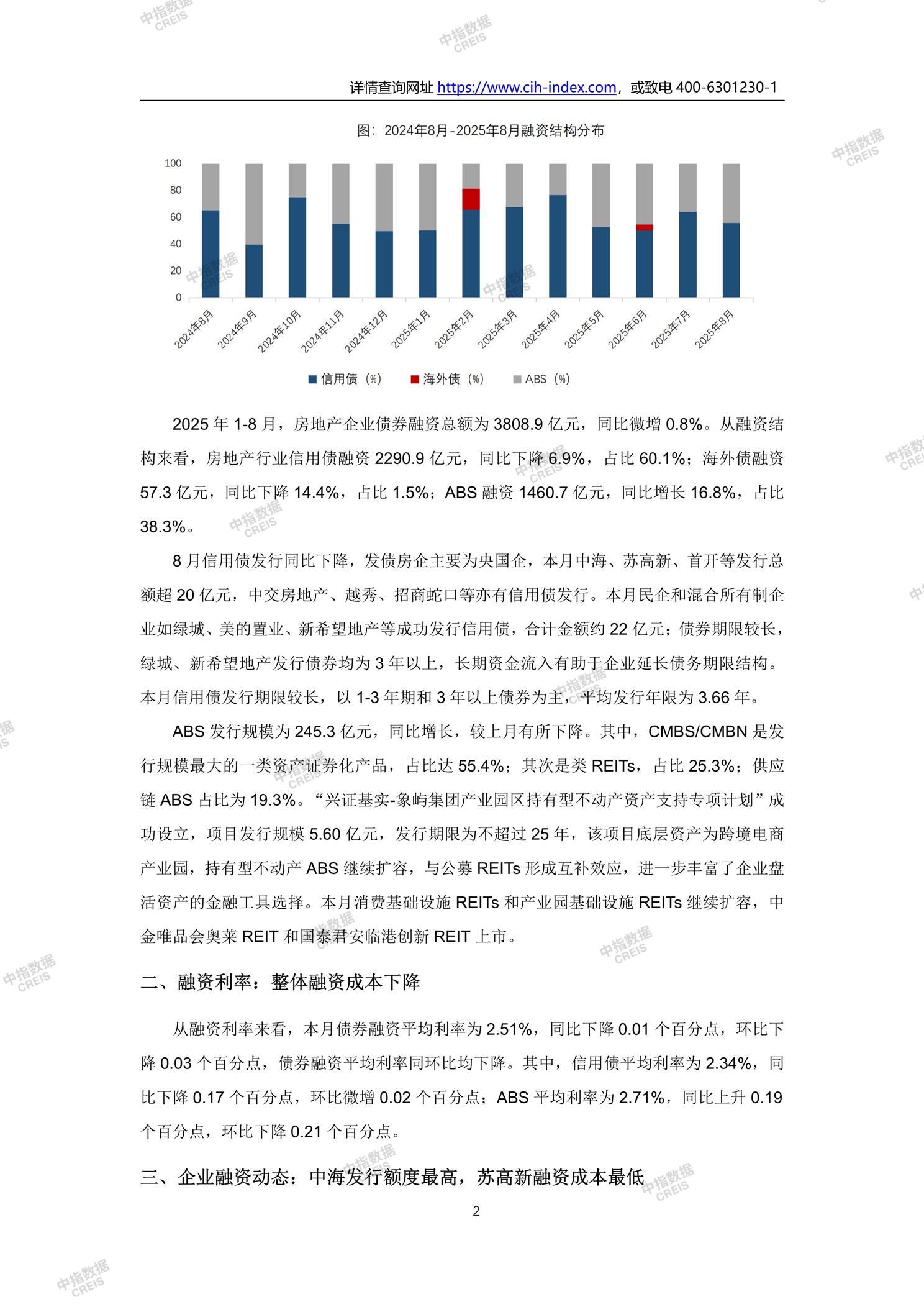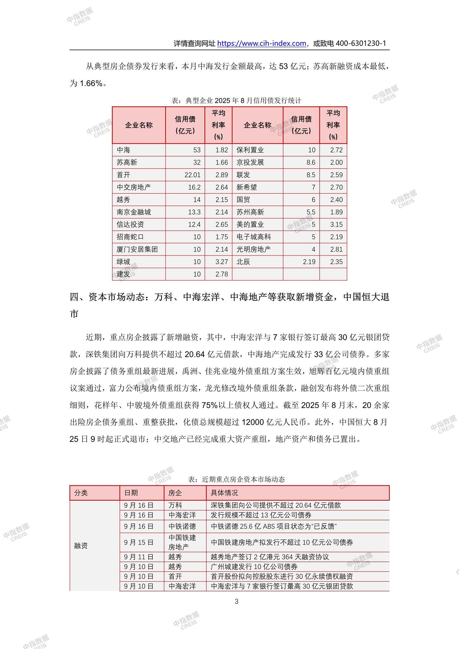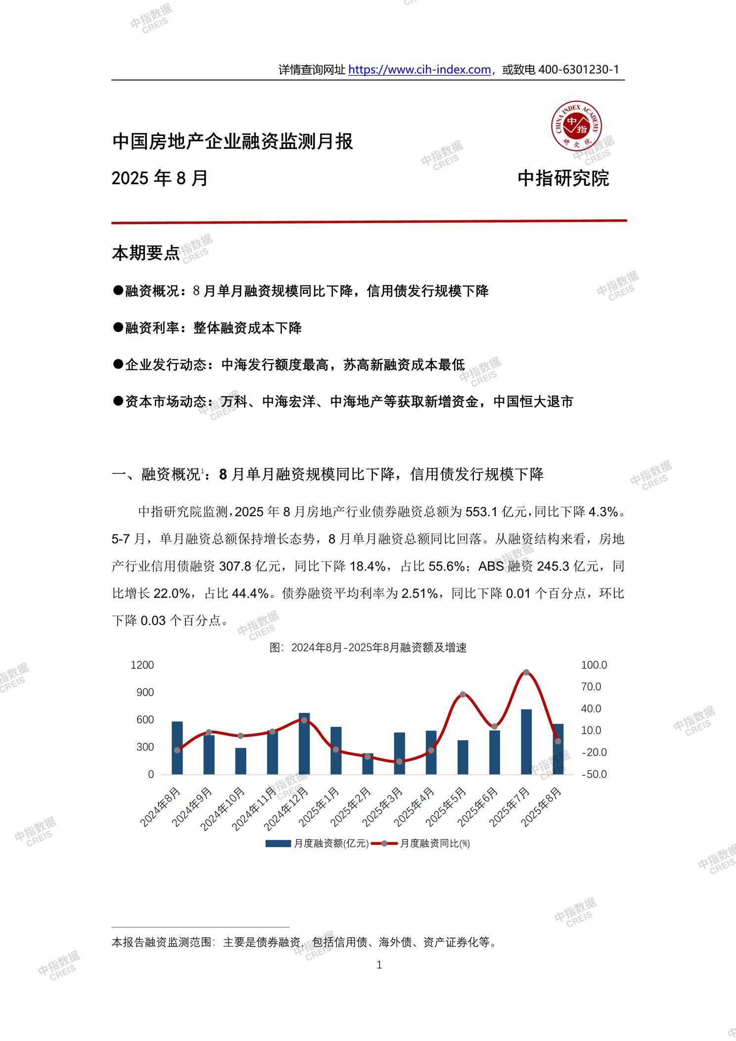 [摘要] 2025年8月中国房地产企业融资监测月报显示,当月房地产行业债券融资总额为553.1亿元,同比下降4.3%,其中信用债融资307.8亿元(占比55.6%),同比下降18.4%,ABS融资245.3亿元(占比44.4%),同比增长22%。整体融资成本下降,债券融资平均利率为2.51%,同环比均小幅下降。典型企业中,中海发行额度最高(53亿元),苏高新融资成本最低(1.66%)。资本市场动态方面,万科、中海等企业获得新增资金,同时中国恒大正式退市。债务重组进展显著,20余家出险房企化债规模超1.2万亿元,佳兆业、旭辉等企业重组方案陆续生效。 【此内容为AI自动生成】