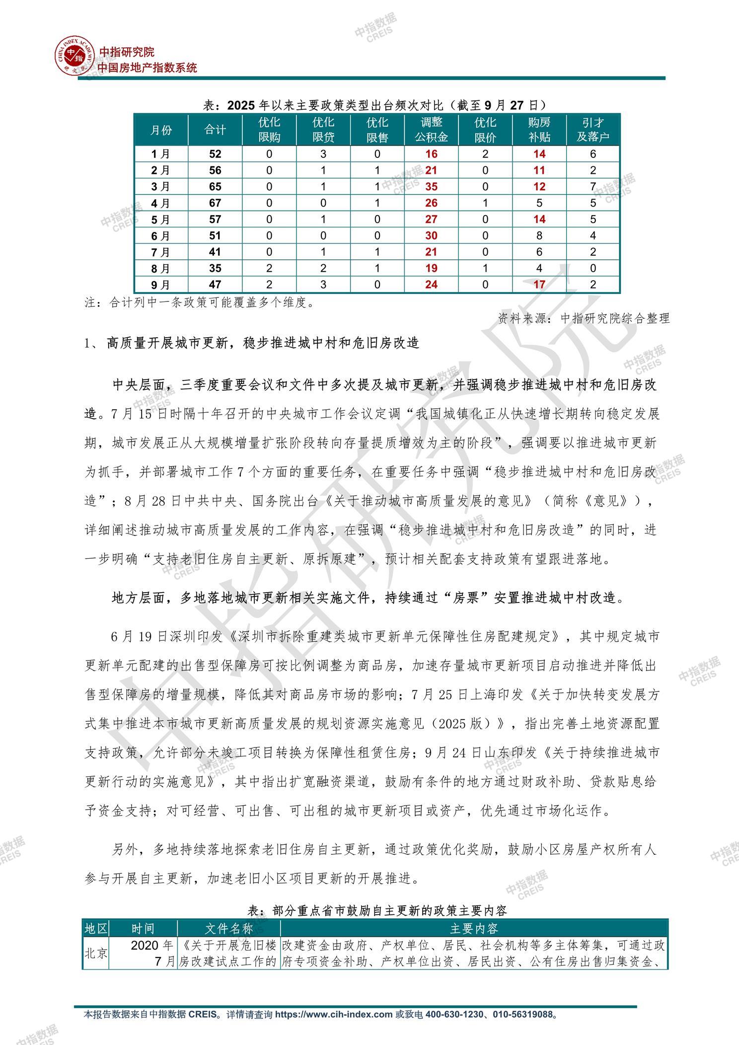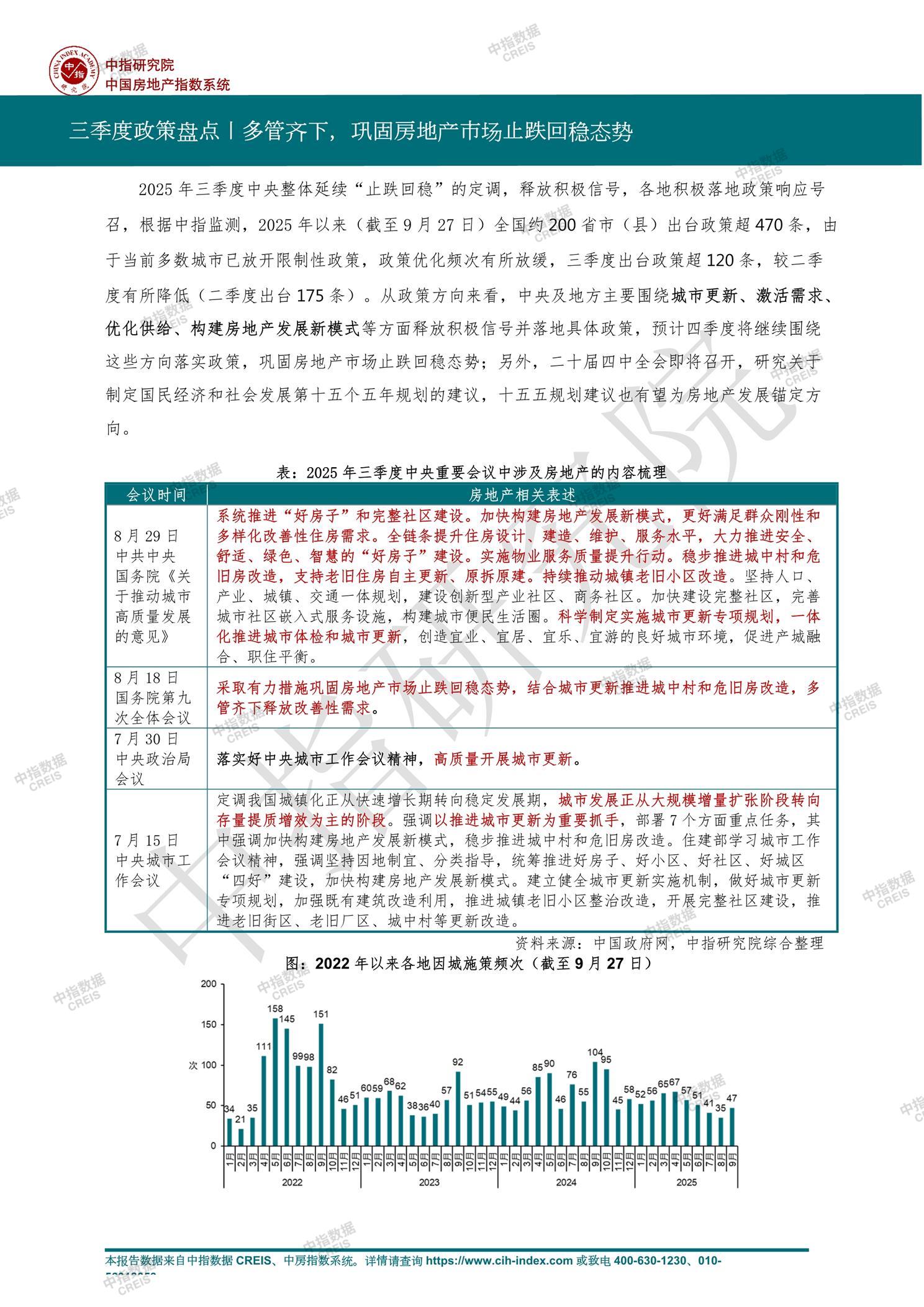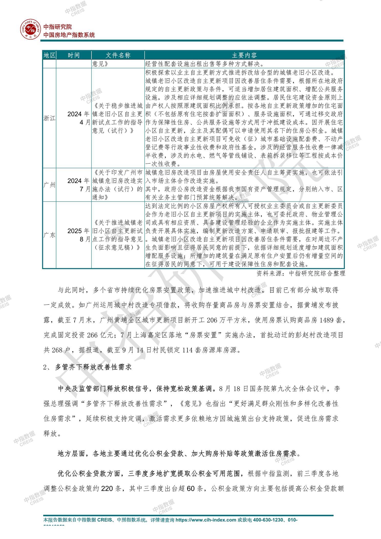 [摘要] 2025年三季度中国房地产政策延续“止跌回稳”基调,中央与地方围绕城市更新、需求激活、供给优化和新模式构建多措并举。中央层面强调推进城中村改造和“好房子”建设,8月《关于推动城市高质量发展的意见》明确支持老旧住房自主更新。地方政策聚焦公积金优化(如上海多孩家庭贷款额度提至216万元)、限购松绑(北京、上海、深圳放宽五环外或外环外购房限制)及购房补贴(衢州三孩家庭补贴20万元)。专项债加速发行盘活存量土地,截至9月全国拟收储2.4亿平方米土地,专项债发行超6200亿元。四季度政策预计延续宽松,重点稳定预期、推进“房票安置”和存量资产盘活,同时二十届四中全会将为“十五五”房地产方向定调。 【此内容为AI自动生成】