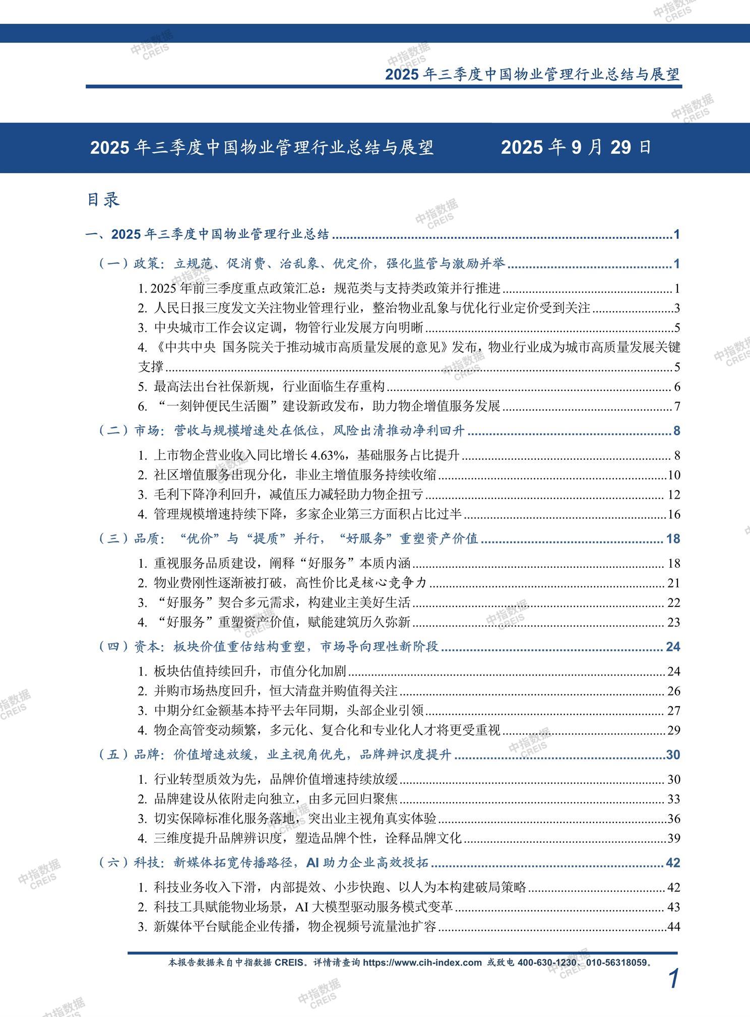 [摘要] 2025年三季度中国物业管理行业呈现政策规范与市场调整并行的特点。政策层面强调合规监管与消费激励,如中央城市工作会议将物管纳入城市治理核心,社保新规推动行业用工规范化,"一刻钟便民生活圈"政策助力增值服务发展。市场方面,上市物企营收增速放缓至4.63%,基础服务占比提升至74.12%,社区增值服务分化,非业主增值持续收缩。行业净利润回升但毛利率降至14.39%,管理规模增速降至3.11%,第三方项目占比过半。品质建设成为战略重点,"好服务"通过标准化、空间活化、增值服务和文化活动重塑资产价值,部分项目溢价达8000元/㎡。资本市场估值修复,港股PE均值14.17倍,华润万象生活市值居首;收并购金额18.2亿元,恒大物业潜在出售引关注。科技应用深化,AI工具赋能客服、能源管理等场景,但科技收入普遍下滑。未来行业将聚焦效益优先、区域深耕和独立市场化,国资与第三方物企受资本青睐,AI技术驱动系统性转型成为关键趋势。 【此内容为AI自动生成】