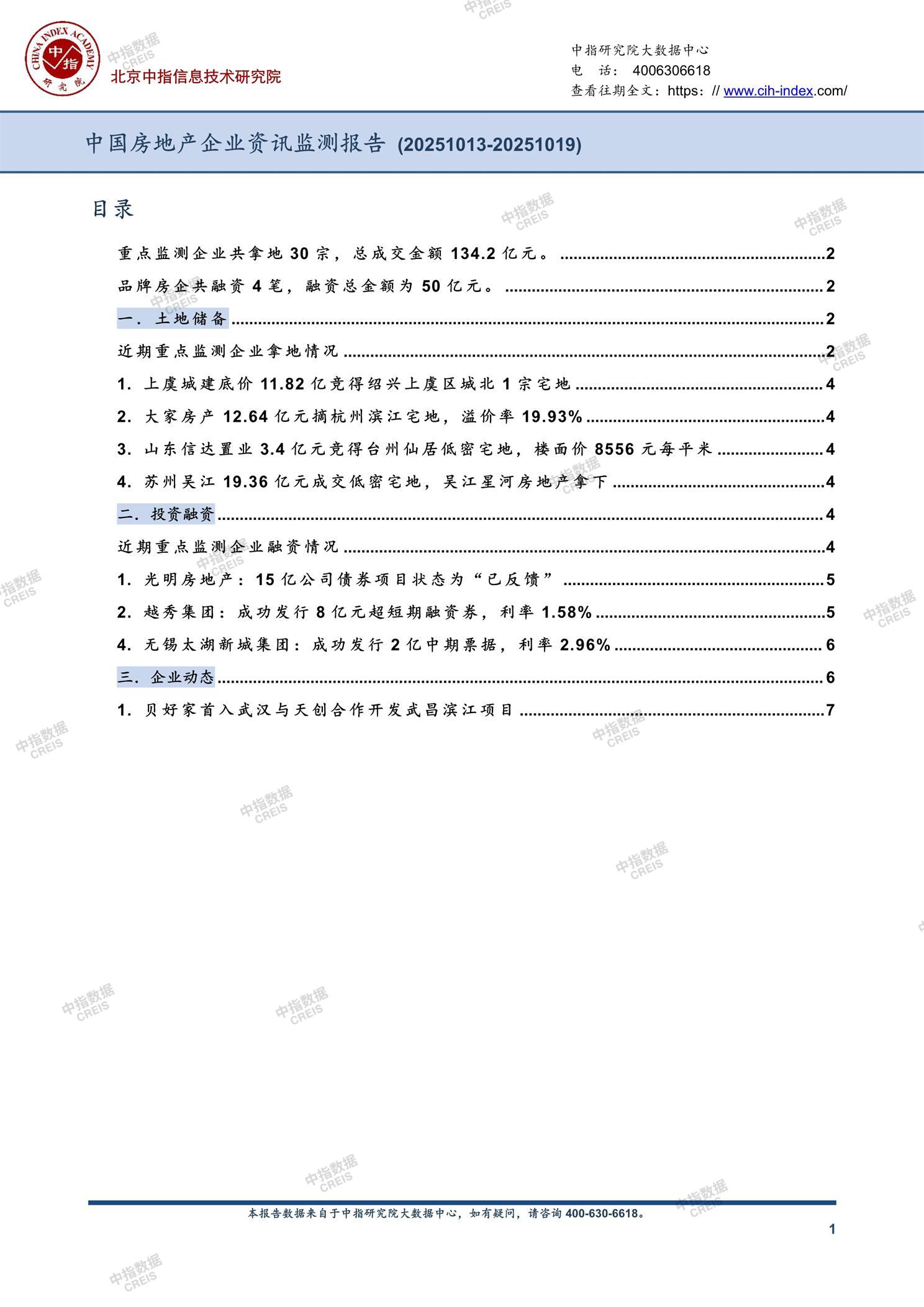[摘要] 2025年10月13日至19日中国房地产企业动态显示,重点监测企业共拿地30宗,总成交金额134.2亿元,其中杭州大家房产以12.64亿元摘得滨江宅地,溢价率19.93%;绍兴上虞城建底价11.82亿元竞得城北宅地。品牌房企融资4笔总金额50亿元,包括越秀集团8亿元超短期融资券(利率1.58%)及无锡太湖新城2亿元中期票据(利率2.96%)。企业动态方面,贝好家首次进入武汉,与天创合作开发武昌滨江改善型住宅项目,持股30%并引入C2M定制模式。 【此内容为AI自动生成】