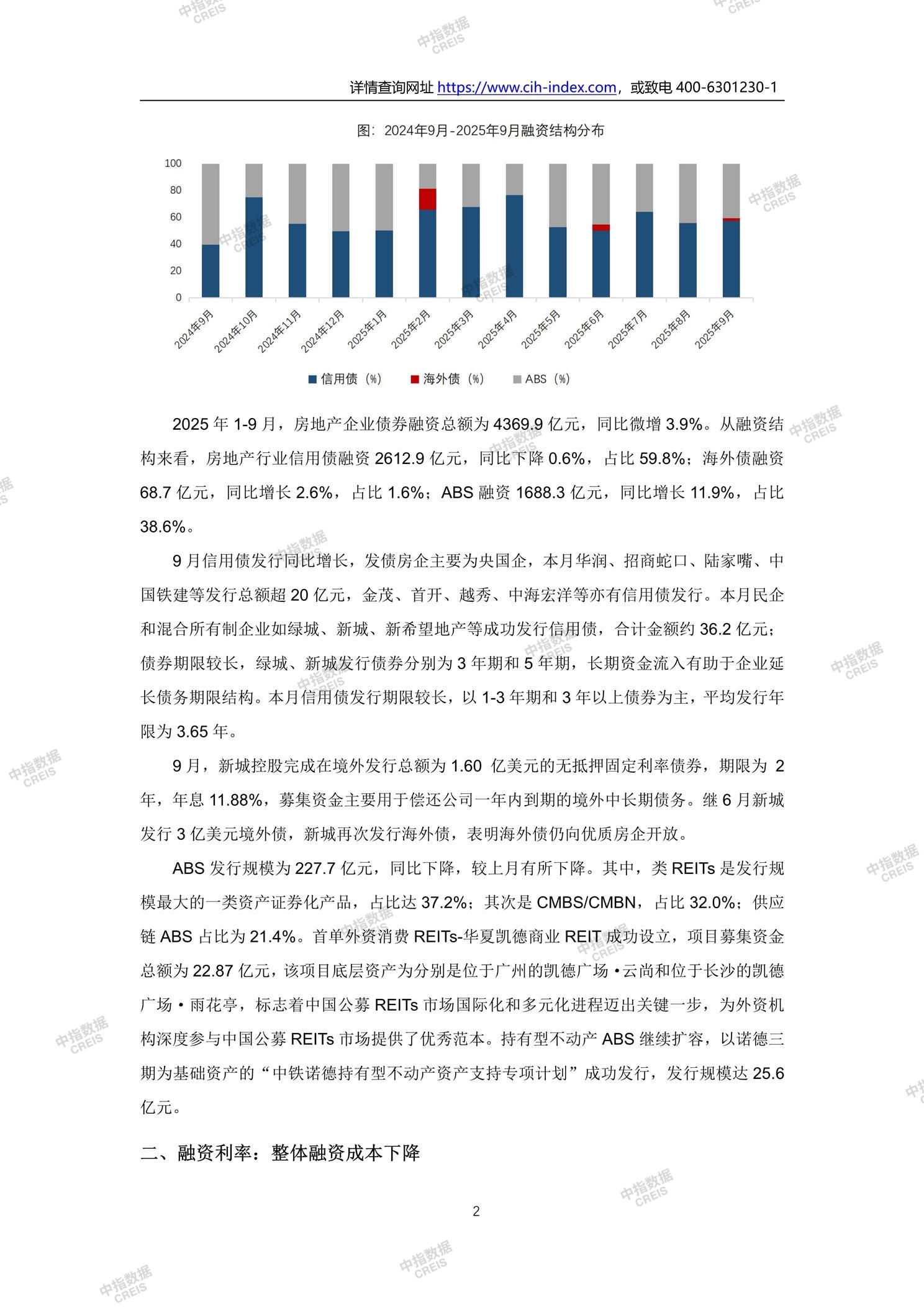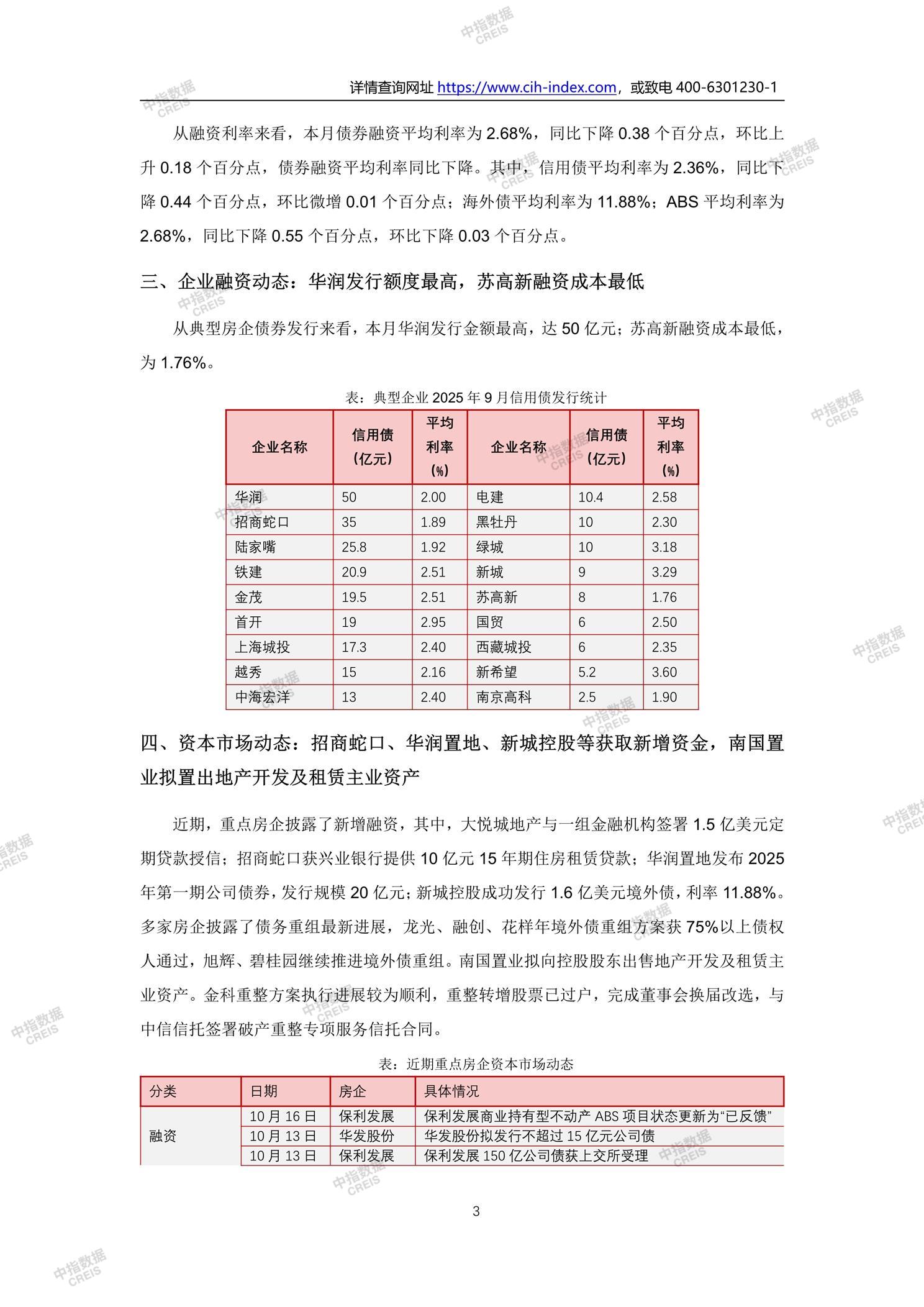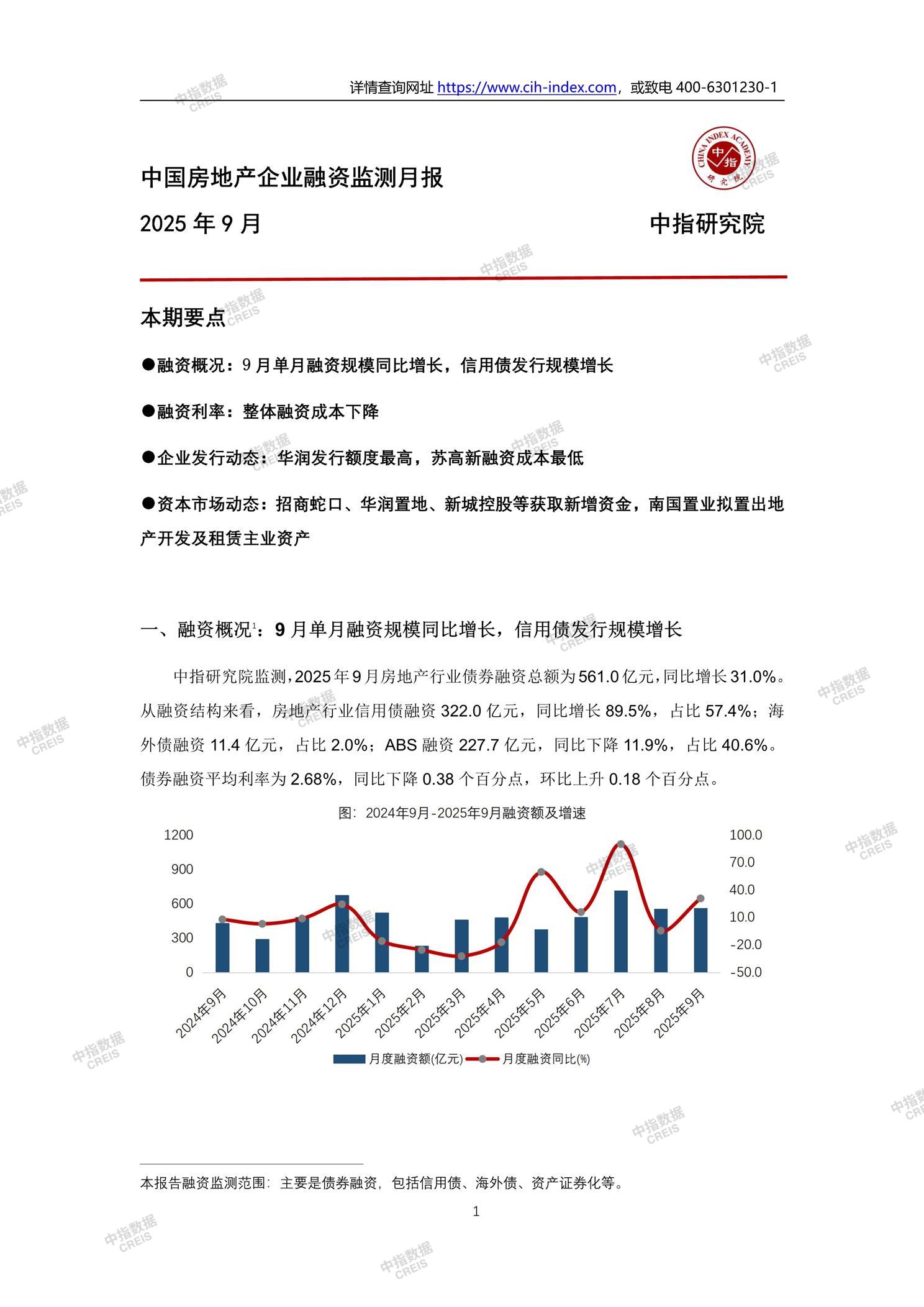 [摘要] 2025年9月中国房地产企业融资监测月报显示,当月房地产行业债券融资总额达561亿元,同比增长31%,其中信用债融资占比57.4%,同比增长89.5%,主要由央国企主导发行。融资成本整体下降,平均利率为2.68%,同比下降0.38个百分点。华润以50亿元发行额居首,苏高新1.76%的利率最低。海外债融资规模较小但利率较高,新城控股发行1.6亿美元债利率达11.88%。ABS发行规模同比下降11.9%,但类REITs占比显著。资本市场动态方面,招商蛇口、华润置地等房企获新增资金,部分房企债务重组取得进展,如龙光、融创方案获债权人高票通过。南国置业拟剥离地产开发主业资产,金科股份重整进展顺利。 【此内容为AI自动生成】