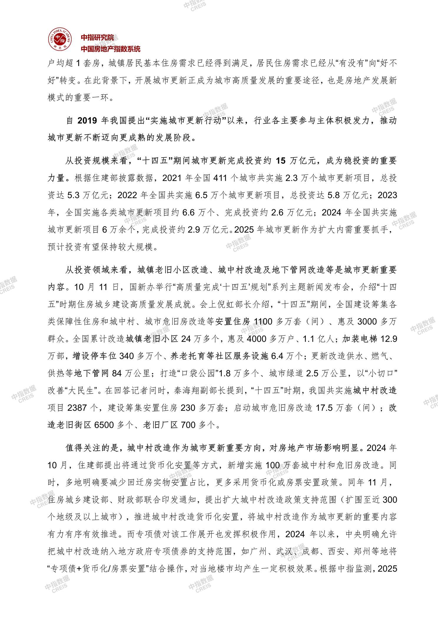 [摘要] 报告指出城市更新将成为“十五五”期间城市发展的重要抓手,政策机制有望加速建立。随着城镇化进入稳定发展阶段,中央多次会议强调城市更新的重要性,如7月中央城市工作会议将其列为城市工作重点。2025年多项政策密集出台,包括《关于持续推进城市更新行动的意见》等,明确了八项主要任务和六大保障措施。数据显示,“十四五”期间城市更新投资达15万亿元,重点领域包括老旧小区改造、城中村改造等,其中城中村改造通过货币化安置等方式对楼市产生积极影响。未来“十五五”时期将强化用地、资金等政策支持,推动城市高质量发展。 【此内容为AI自动生成】