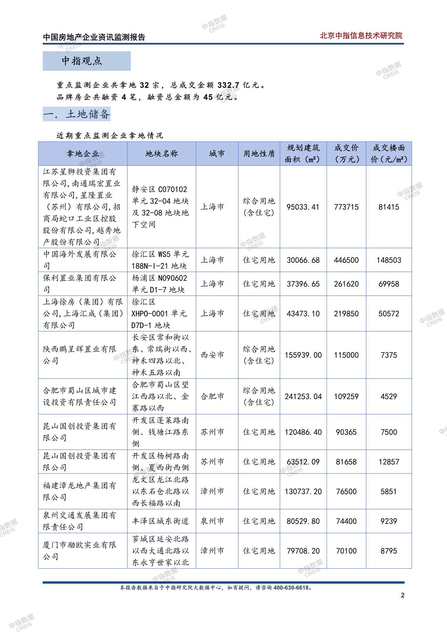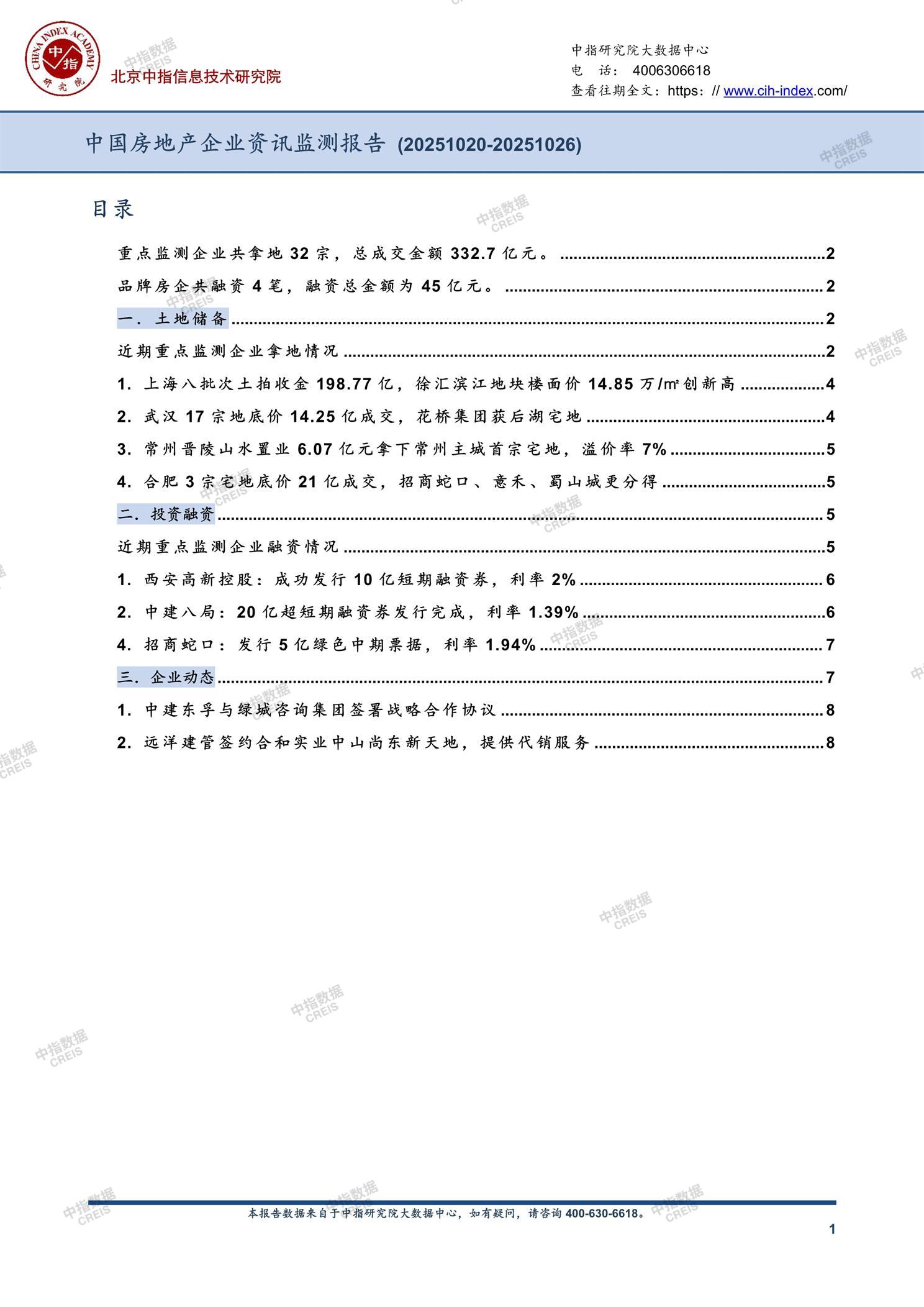 [摘要] 2025年10月20日至26日中国房地产企业资讯监测报告显示,重点监测企业共拿地32宗,总成交金额332.7亿元,其中上海八批次土拍收金198.77亿元,徐汇滨江地块楼面价14.85万/㎡创新高。武汉17宗地全部底价成交,常州晋陵山水置业以6.07亿元溢价7%拿下常州主城首宗宅地。品牌房企共融资4笔,总金额45亿元,包括西安高新控股10亿短期融资券(利率2%)、中建八局20亿超短期融资券(利率1.39%)、保利置业10亿公司债及招商蛇口5亿绿色中期票据(利率1.94%)。企业动态方面,中建东孚与绿城咨询集团签署战略合作协议,远洋建管签约中山尚东新天地项目提供代销服务。 【此内容为AI自动生成】