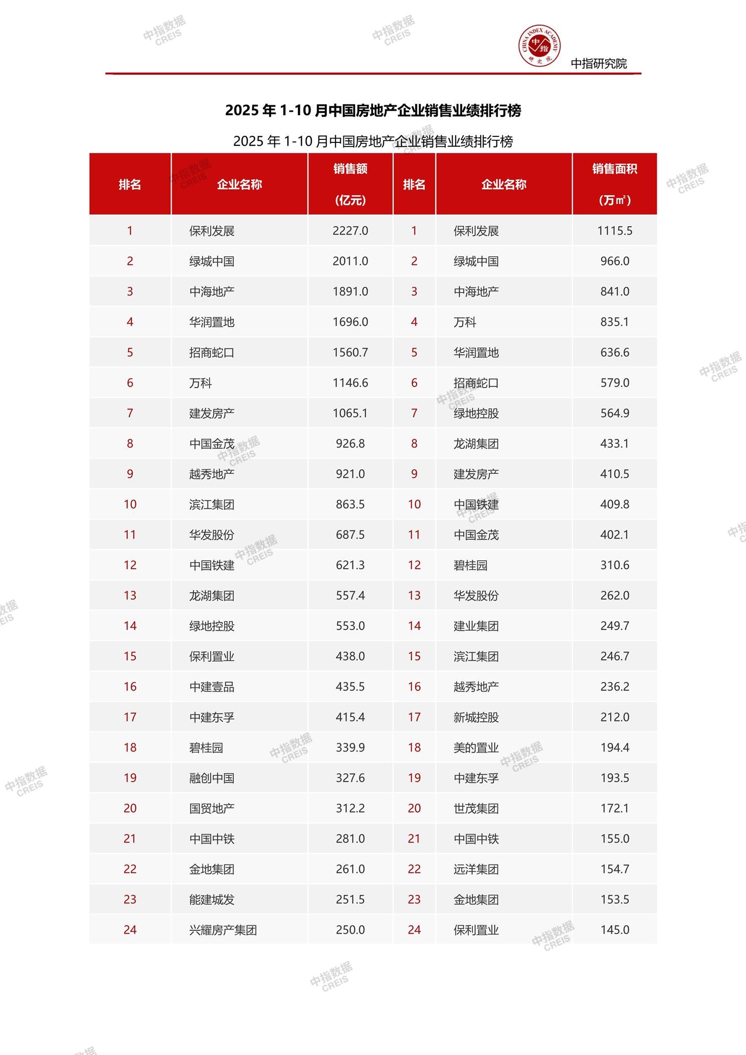 [摘要] 2025年1-10月中国房地产企业销售业绩显示,TOP100房企销售总额为28967.1亿元,同比下降16.3%,降幅较1-9月扩大4.1个百分点。各阵营房企销售额均有所下降,其中TOP10房企销售额均值为1430.9亿元,同比下降15.0%。保利发展以2227亿元销售额位居榜首,绿城中国和中海地产紧随其后。高品质产品成为市场驱动力,部分热销项目如上海保利天奕和成都东城金茂晓棠表现突出。展望未来,多地优化“好房子”政策,年末房企冲刺或改善重点城市供应,但市场仍需中央多措并举以稳定预期。 【此内容为AI自动生成】