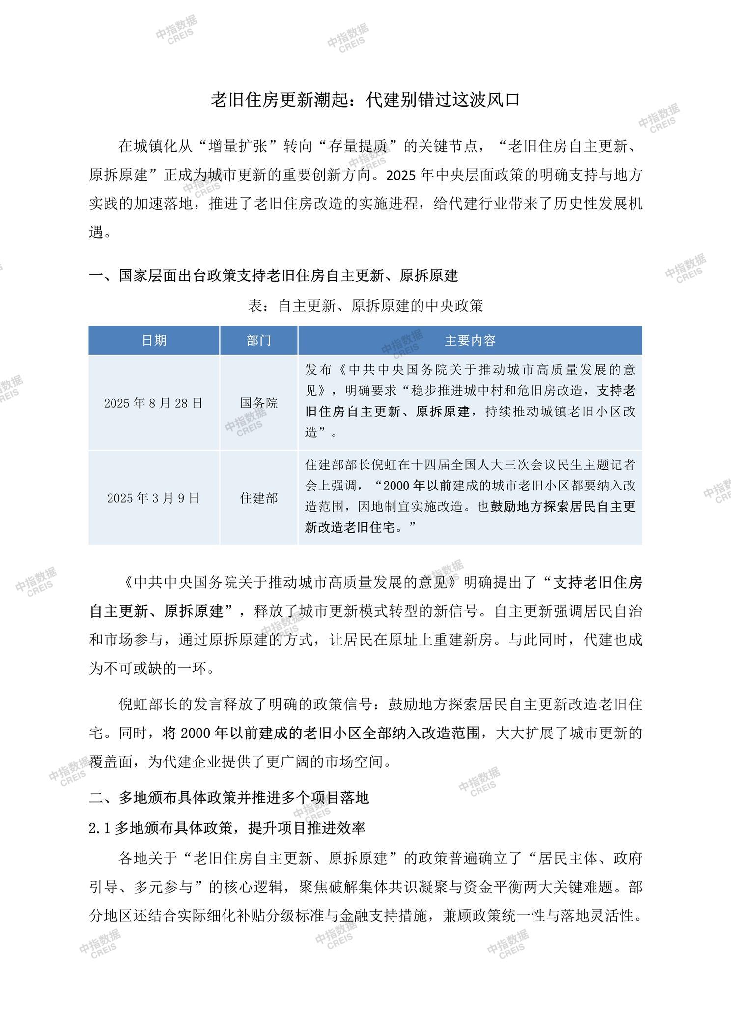 [摘要] 2025年下半年老旧住房更新成为城市更新的重要方向,中央政策明确支持老旧住房自主更新和原拆原建,各地也纷纷出台具体政策推进项目实施。北京、上海、浙江、广东和厦门等地通过细化补贴分级标准和金融支持措施,提升项目推进效率。典型案例显示,代建企业在项目中发挥资源整合和专业执行作用,解决居民共识和资金难题。代建企业需建立全周期服务模式,联动多方资源破解资金瓶颈,并重点布局政策先行区域以抢占市场先机。这一趋势为代建行业带来巨大发展机遇。 【此内容为AI自动生成】