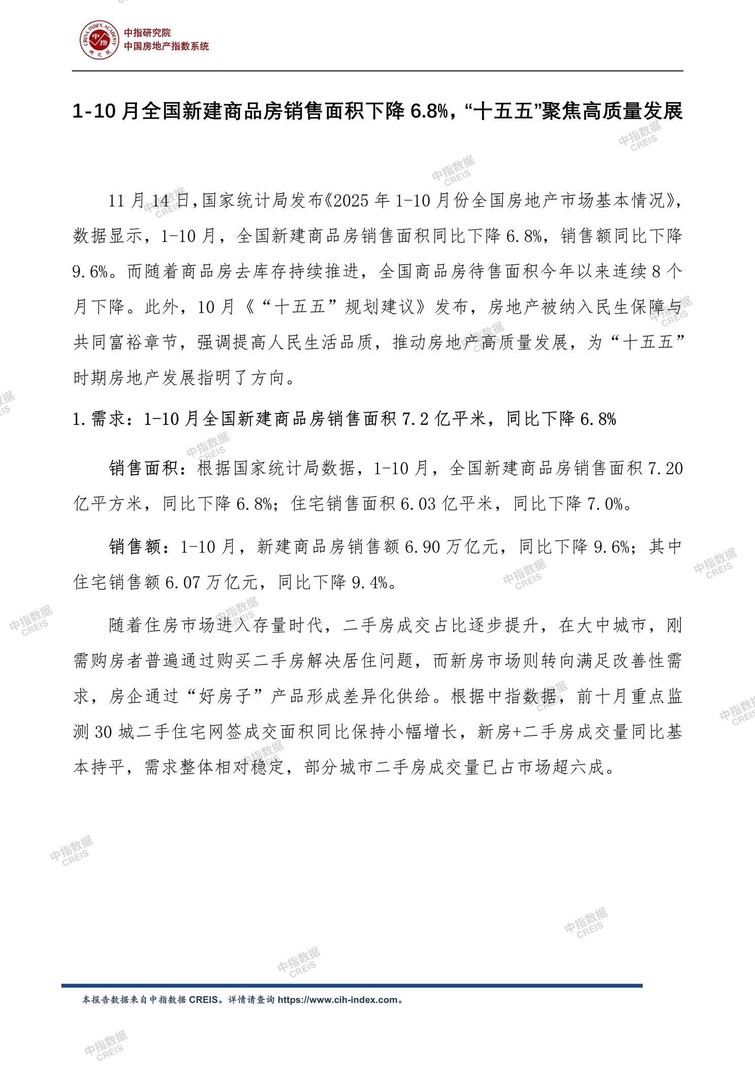 《中指丨2025年1-10月全国房地产开发经营数据解读》