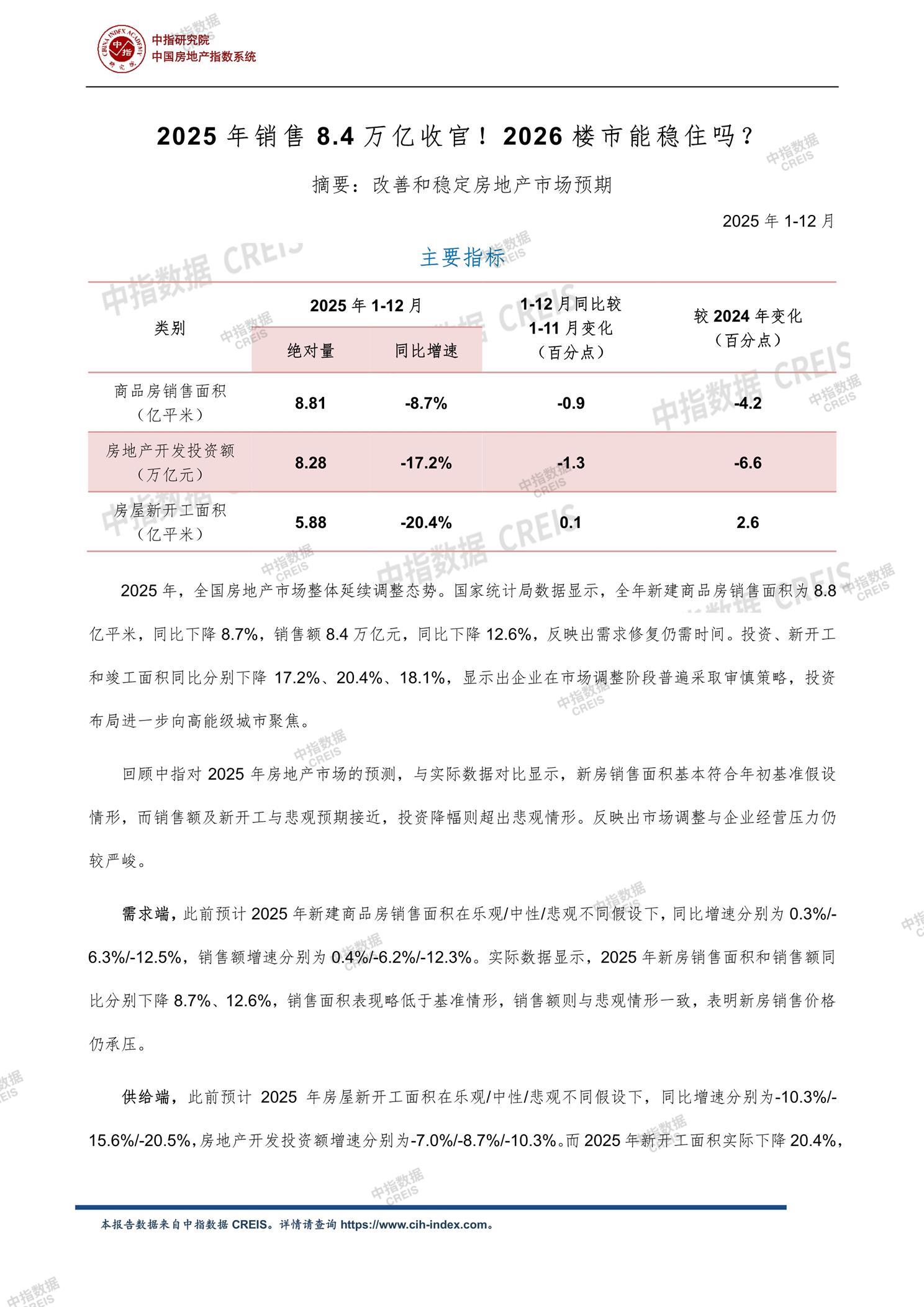 [摘要] 2025年全国房地产市场延续调整态势,商品房销售面积8.8亿平米同比下降8.7%,销售额8.4万亿元同比下降12.6%,投资、新开工和竣工面积同比分别下降17.2%、20.4%、18.1%。市场调整与企业经营压力严峻,新房销售价格承压。2026年政策释放“稳预期”信号,预计销售面积同比下降6.2%,降幅收窄,市场分化延续。中长期看,房地产市场有望在“十五五”中后期逐步筑底,迈向高质量发展阶段。 【此内容为AI自动生成】
