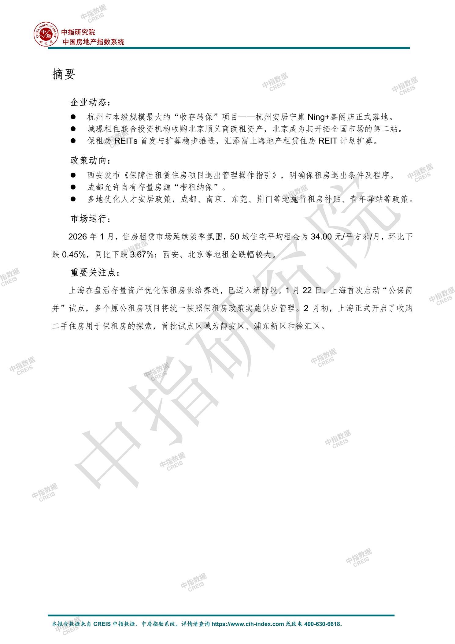 [摘要] 2026年1月中国住房租赁市场呈现以下特点:企业方面,万科泊寓、龙湖冠寓和瓴寓国际在开业和管理规模上位居前三,地方国企开业规模稳中有增。政策层面,多地优化保租房供给,如西安明确退出机制,成都允许“带租纳保”,上海启动“公保简并”试点并探索收购二手房用于保租房。市场运行上,50城住宅平均租金环比下跌0.45%,同比下跌3.67%,仅北海租金环比上涨。上海在盘活存量资产优化保租房供给方面表现突出,通过政策创新和金融支持推动市场发展。 【此内容为AI自动生成】