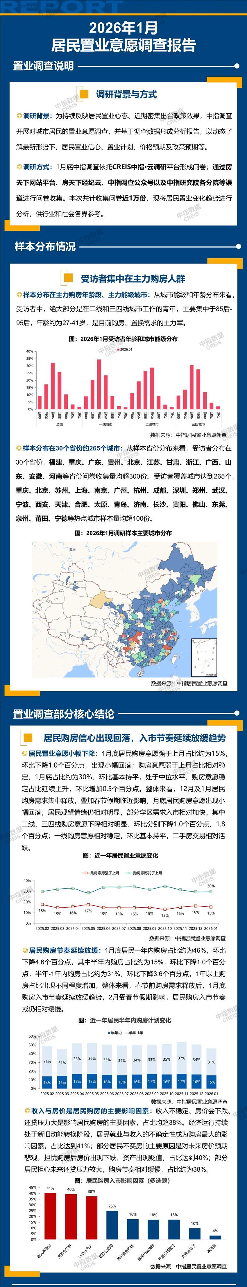 [摘要] 2026年1月居民置业意愿调查报告显示,居民购房信心出现回落,置业意愿小幅下降,观望情绪明显。调查覆盖30个省份265个城市,受访者主要为85后-95后青年群体。收入不稳定、房价下跌预期和还贷压力是影响购房决策的三大主因,占比均超38%。居民收入预期略有改善但整体仍弱,房价下跌预期进一步走强至33%,储蓄意愿维持55%的高位。受春节假期影响,购房节奏延续放缓趋势,短期内市场活跃度或持续低迷。报告数据来源于中指研究院近1万份问卷调研,反映当前房地产市场供需两端信心不足的现状。 【此内容为AI自动生成】