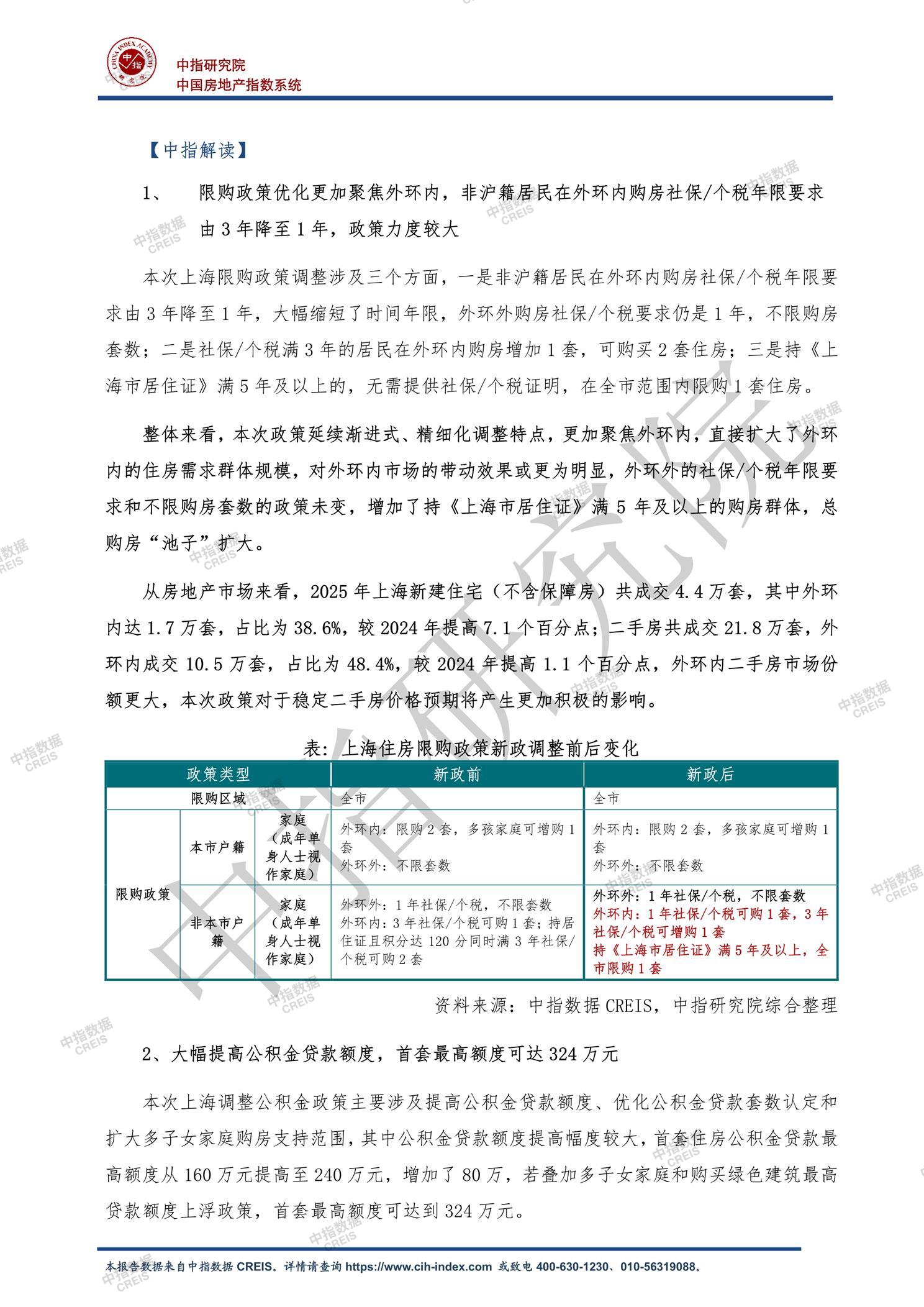[摘要] 2026年2月25日,上海市五部门联合印发《关于进一步优化调整本市房地产政策的通知》,主要从三方面调整政策:一是大幅缩短非沪籍居民外环内购房社保/个税年限要求,由3年降至1年,并扩大持居住证满5年群体的购房资格;二是提高公积金贷款额度,首套最高可达324万元,并优化多子女家庭支持政策;三是完善房产税政策,对沪籍家庭成年子女唯一住房免征房产税。这些政策力度较大且精细化,旨在扩大购房群体规模、降低置业成本。报告指出,2025年上海外环内新房和二手房成交占比提升,新政将更有效稳定二手房市场。叠加2月初保障性租赁住房试点政策,上海楼市短期有望迎来“小阳春”,并率先止跌回稳。 【此内容为AI自动生成】