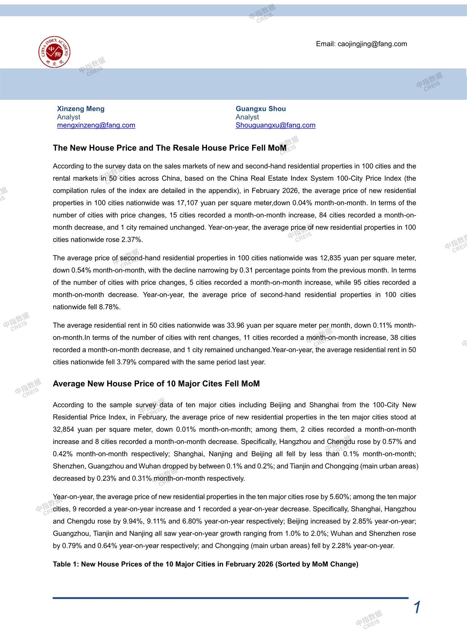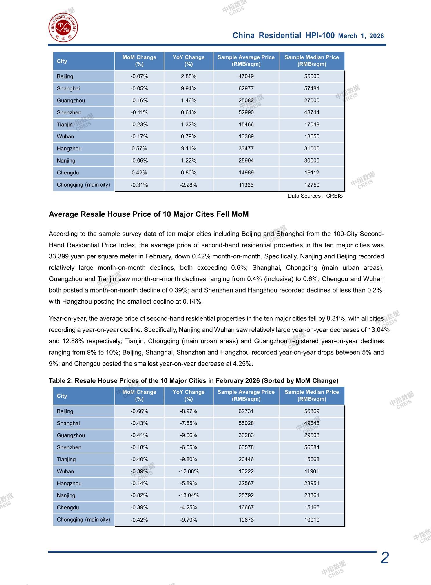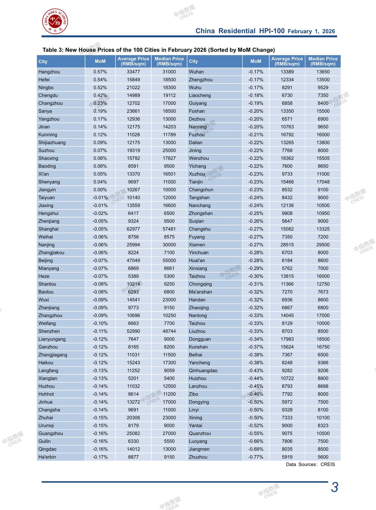 CREIS China Residential HPI-100 Monthly(February 2026)