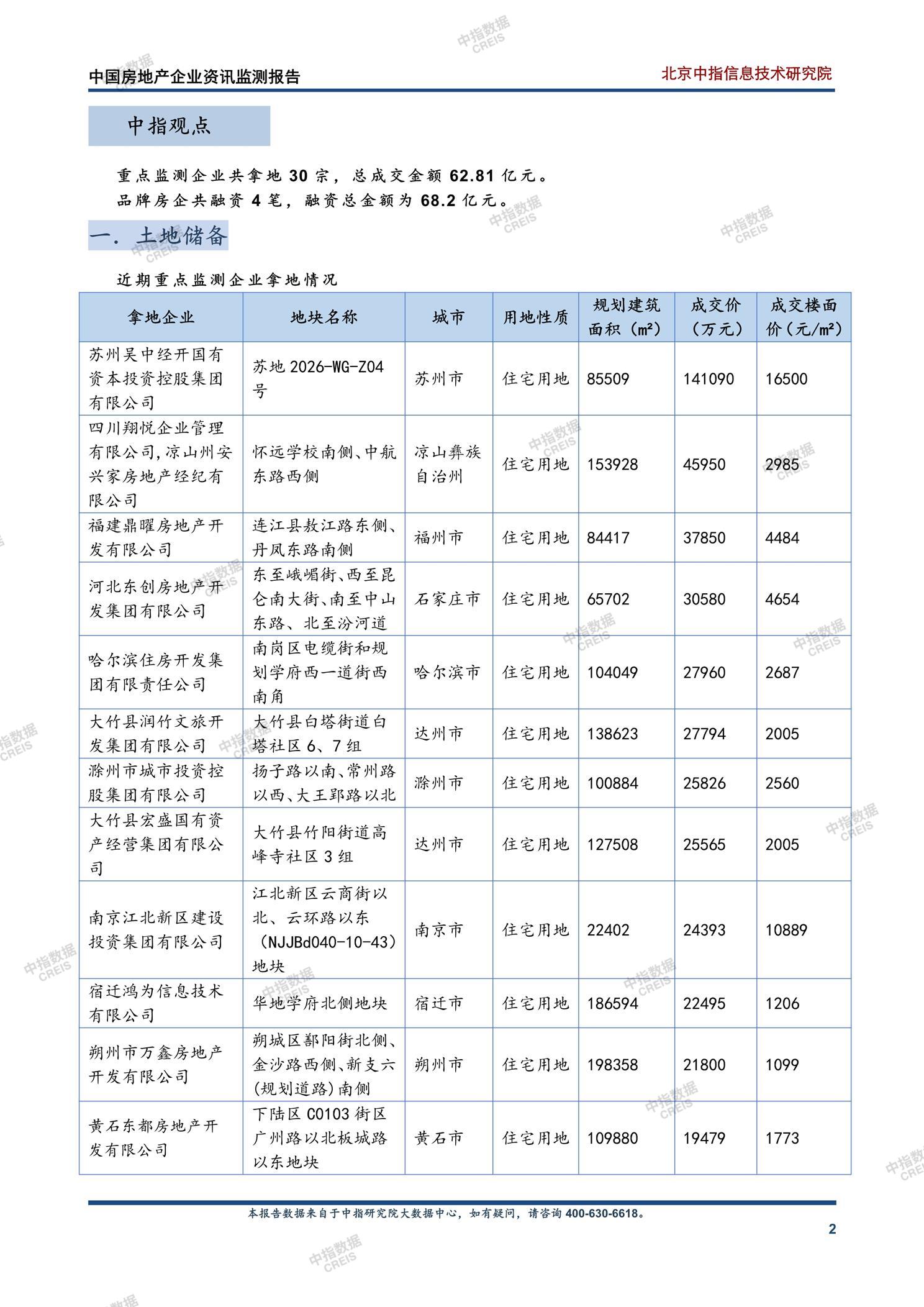 [摘要] 2026年4月13日至19日期间,中国房地产市场呈现以下动态:重点监测企业共拿地30宗,总成交金额135.86亿元,涉及苏州、南京、福州等城市,其中苏州吴中滨湖置业以14.1亿元底价竞得太湖新城宅地。品牌房企融资4笔,总金额68.2亿元,包括济南城投集团发行23.2亿元公司债、广州城投发行10亿元中期票据等。企业动态方面,中建一局与深农投集团签署战略合作协议,聚焦城市更新等领域;安居宁巢签约杭州城建集团,承接120套存量房改造为保租房。报告显示房企拿地以住宅用地为主,融资成本维持较低水平,企业合作聚焦民生与城市更新领域。 【此内容为AI自动生成】