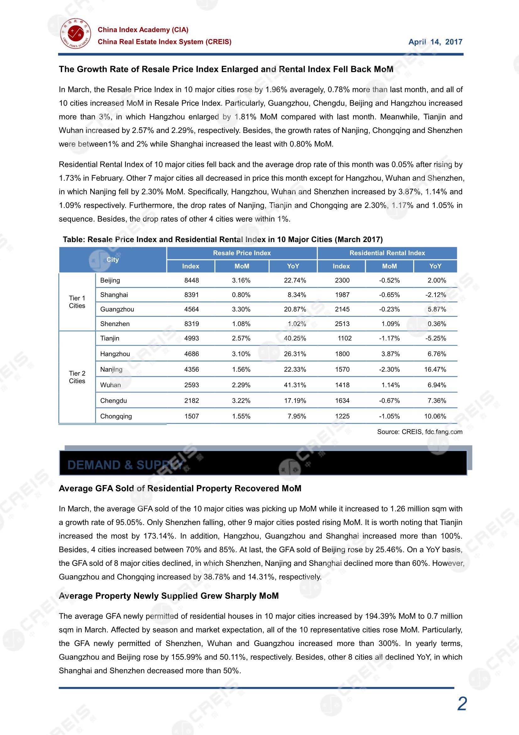 [摘要] Ministry of Housing and Urban-Rural Development Regulated the Agents’ Behavior. Chengdu Government Perfected the Policy on Housing Purchase Restriction. 9 Major Cities’ Composite Price Indices Rose MoM while Shenzhen Continued to Fall. The Growth Rate of Resale Price Index Enlarged and Rental Index Fell Back MoM. Average GFA Sold of Residential Property Recovered MoM. Average Property Newly Supplied Grew Sharply MoM. The Average Inventory Continued to Fall and Clearing Period Extended. Both Sales and GFA Sold of Representative Developers Continued to Increase MoM and YoY. Both Land Acquired and Land Acquisition in Value Recovered MoM.