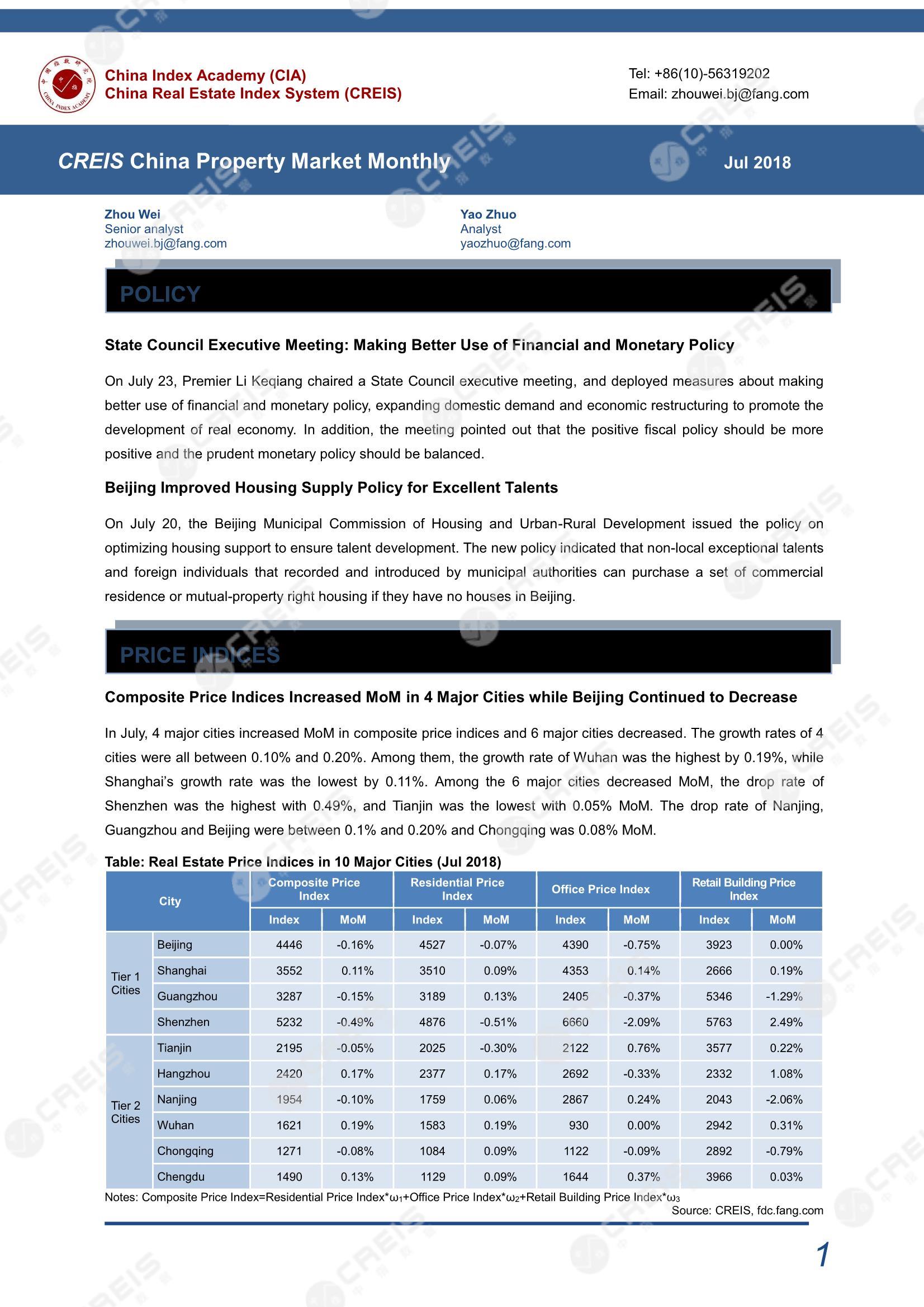 [摘要] State Council Executive Meeting: Making Better Use of Financial and Monetary Policy. Beijing Improved Housing Supply Policy for Excellent Talents. Composite Price Indices Increased MoM in 4 Major Cities while Beijing Continued to Decrease. Both the Average Resale Price Index and Rental Index Increased MoM. Average GFA Sold of Residential Property Fell back MoM. Average Property Newly Supplied Fell back MoM. The Average Inventory Continued to Increase and the Clearing Period Shortened. Both Sales in Value and GFA Sold of Representative Developers Continued to Increase YoY. Both Land Acquired and Land Acquisition in Value Fell back MoM.