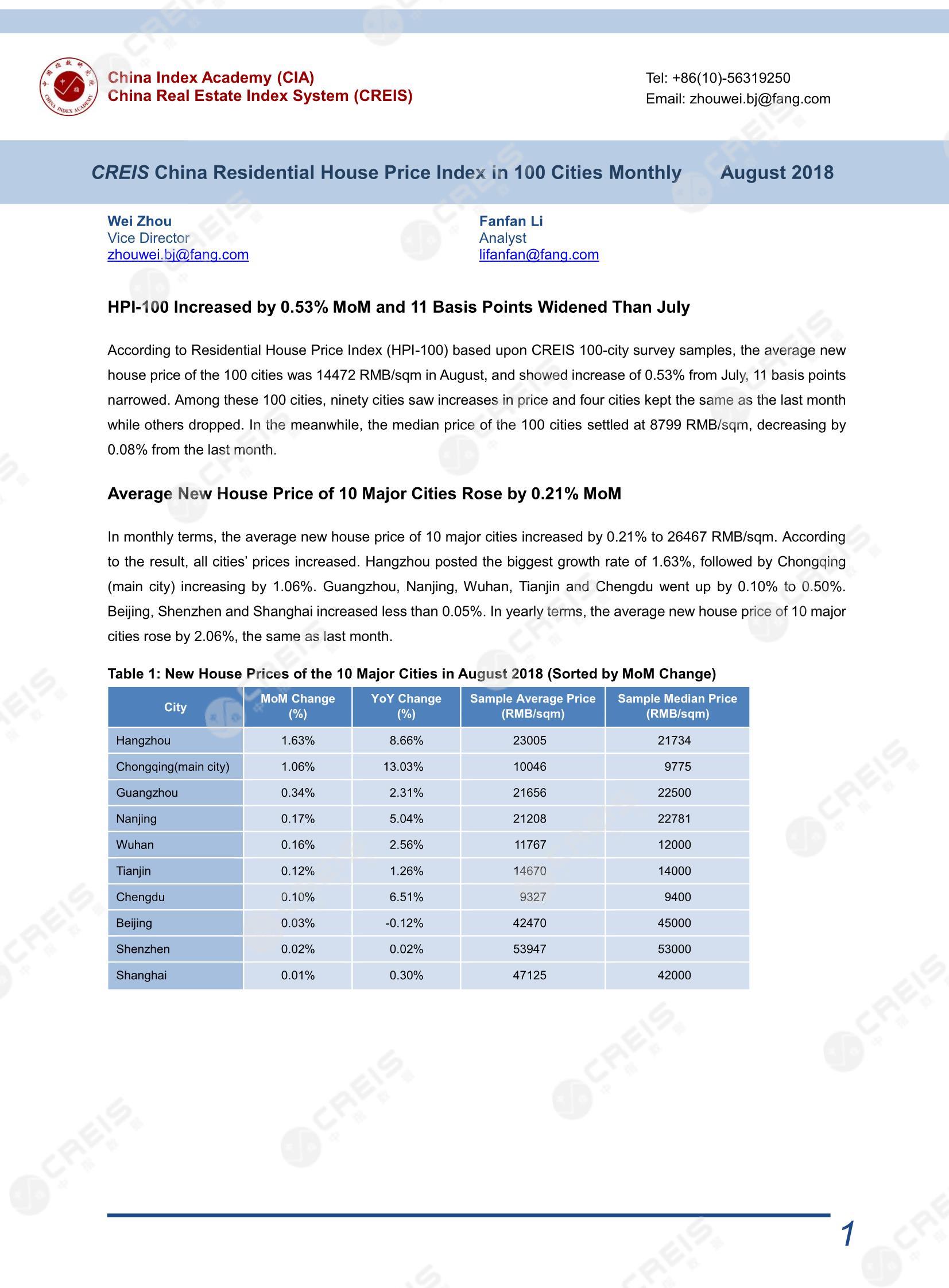 [摘要] HPI-100 Increased by 0.53% MoM and 11 Basis Points Widened Than July. Average New House Price of 10 Major Cities Rose by 0.21% MoM . Average Resale House Price of 10 Major Cites Settled at 39276 RMB/sqm and Increased by 0.14% MoM .