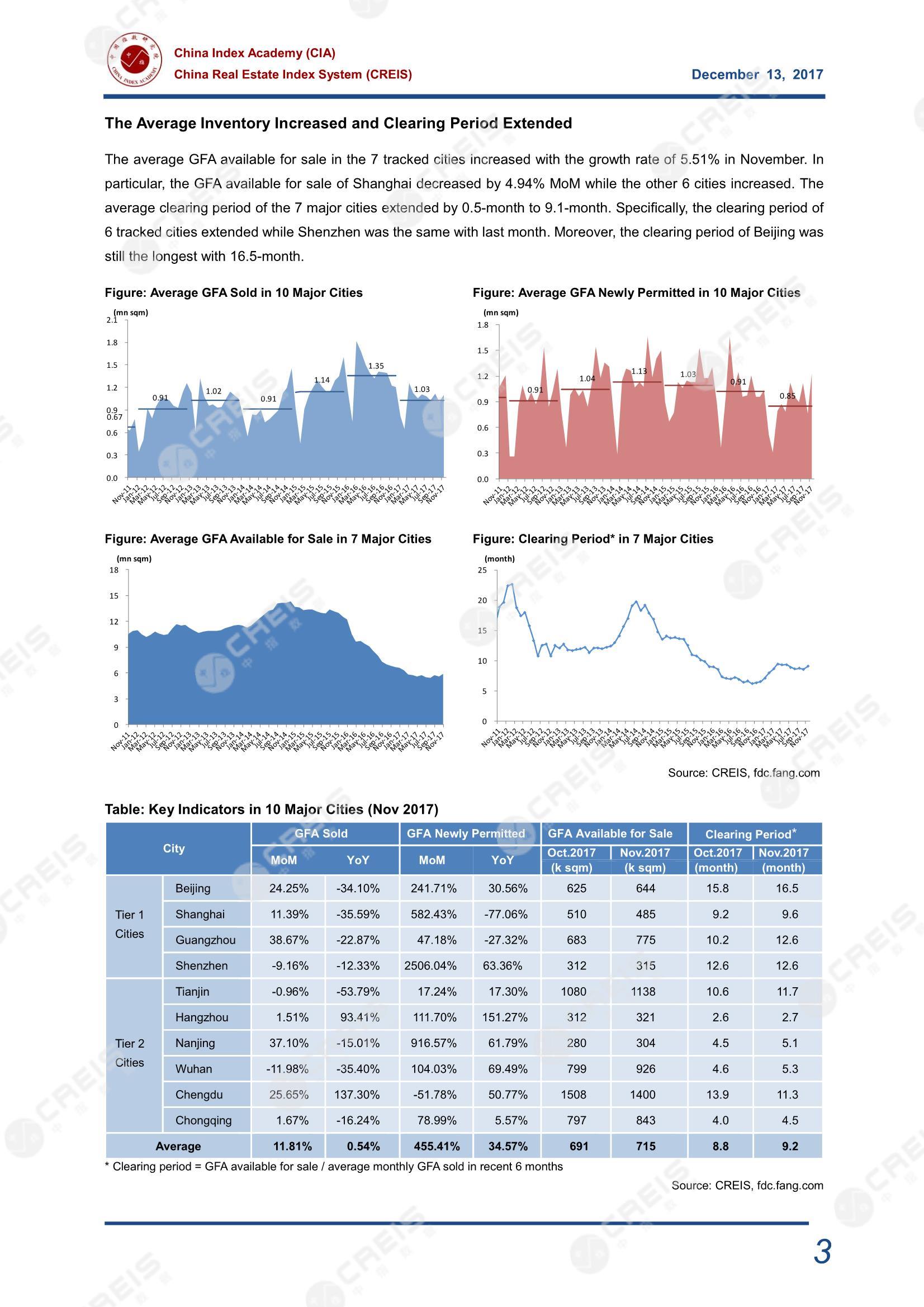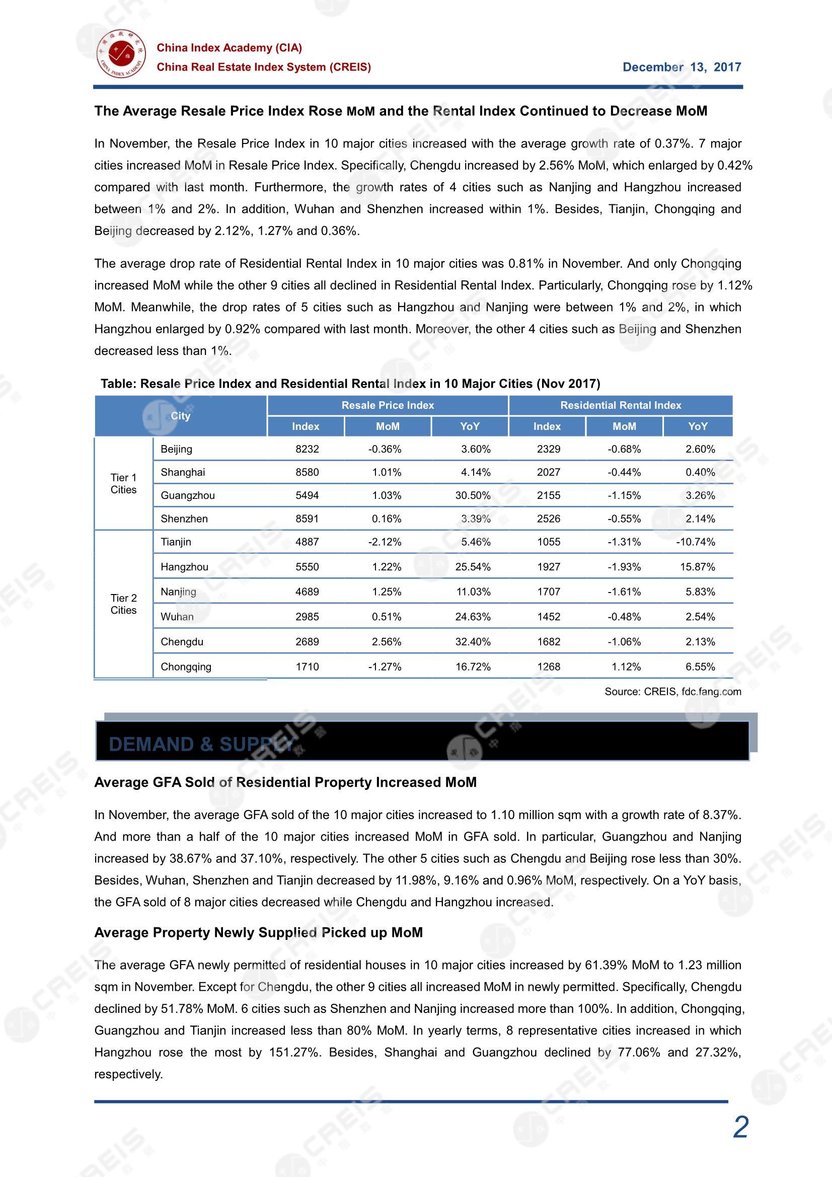 [摘要] The Three Ministries Required Vigorously Develop the Housing Rental Market.Chengdu Strengthened the Risk Prevention and Control Work in the Real Estate Sector.9 Major Cities’ Composite Price Indices Increased MoM while Beijing Continued to Decrease.The Average Resale Price Index Rose MoM and the Rental Index Continued to Decrease MoM.Average GFA Sold of Residential Property Increased MoM.Average Property Newly Supplied Picked up MoM.The Average Inventory Increased and Clearing Period Extended.Both Sales in Value and GFA Sold of Representative Developers Continued to Increase YoY.Both Land Acquired and Land Acquisition in Value Fell back MoM.