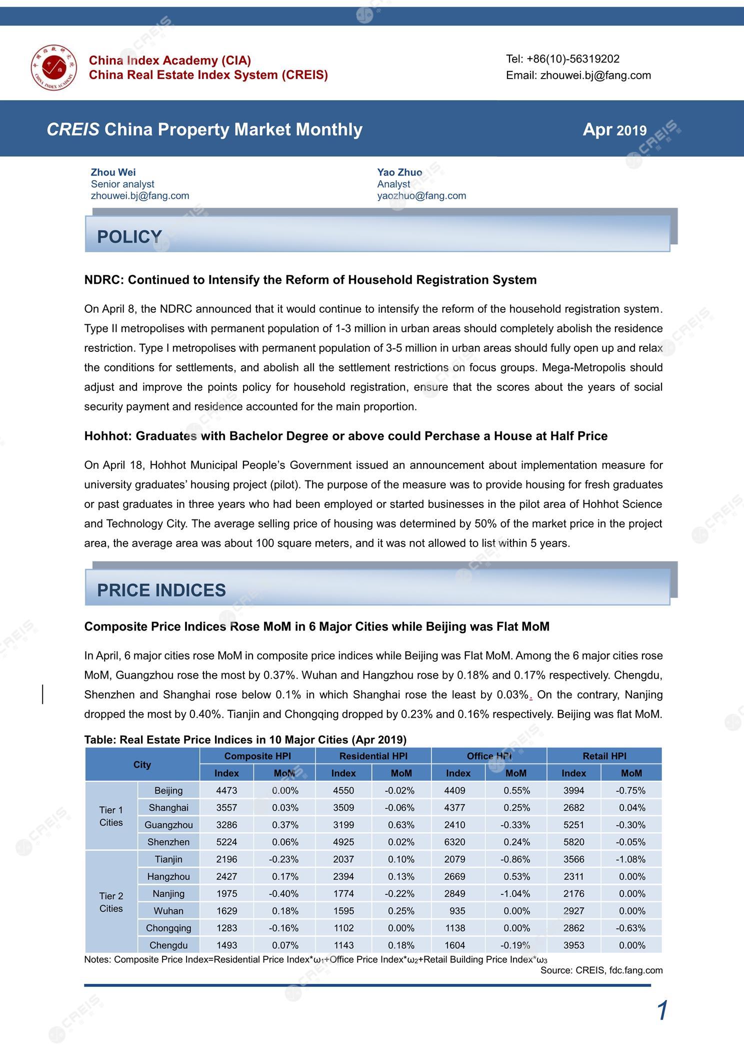 [摘要] NDRC: Continued to Intensify the Reform of Household Registration System On April 8, the NDRC announced that it would continue to intensify the reform of the household registration system. Type II metropolises with permanent population of 1-3 million in urban areas should completely abolish the residence restriction. Type I metropolises with permanent population of 3-5 million in urban areas should fully open up and relax the conditions for settlements, and abolish all the settlement restrictions on focus groups. Mega-Metropolis should adjust and improve the points policy for household registration, ensure that the scores about the years of social security payment and residence accounted for the main proportion. Composite Price Indices Rose MoM in 6 Major Cities while Beijing was Flat MoM In April, 6 major cities rose MoM in composite price indices while Beijing was Flat MoM. Among the 6 major cities rose MoM, Guangzhou rose the most by 0.37%. Wuhan and Hangzhou rose by 0.18% and 0.17% respectively. Chengdu, Shenzhen and Shanghai rose below 0.1% in which Shanghai rose the least by 0.03% On the contrary, Nanjing dropped the most by 0.40%. Tianjin and Chongqing dropped by 0.23% and 0.16% respectively. Beijing was flat MoM.