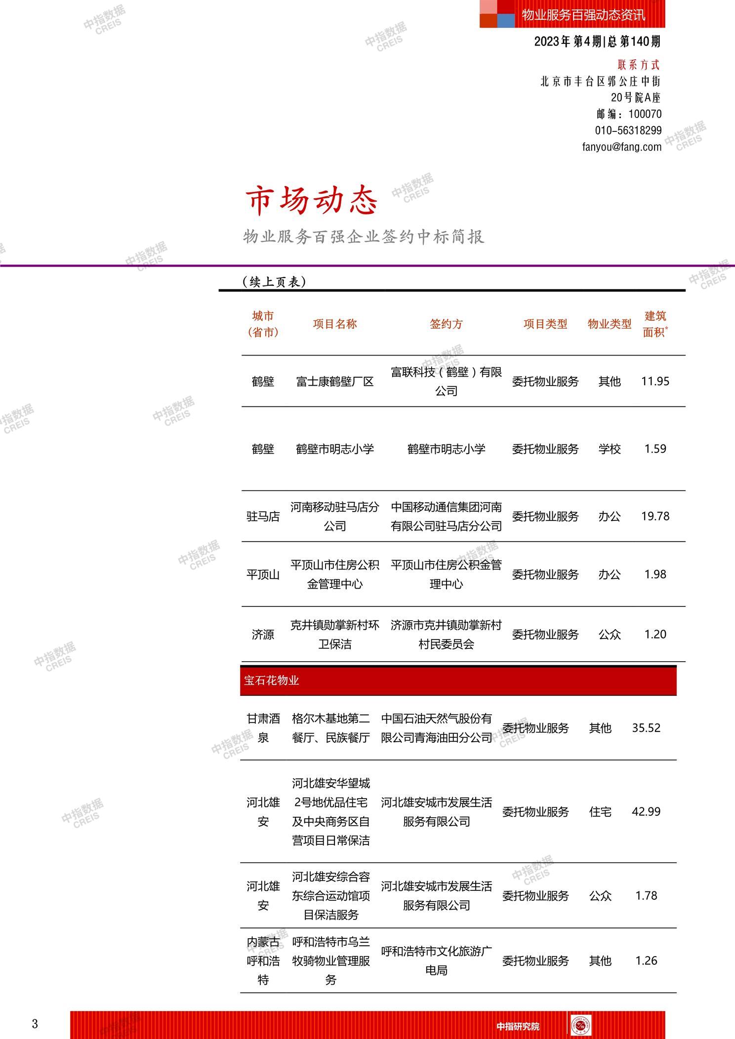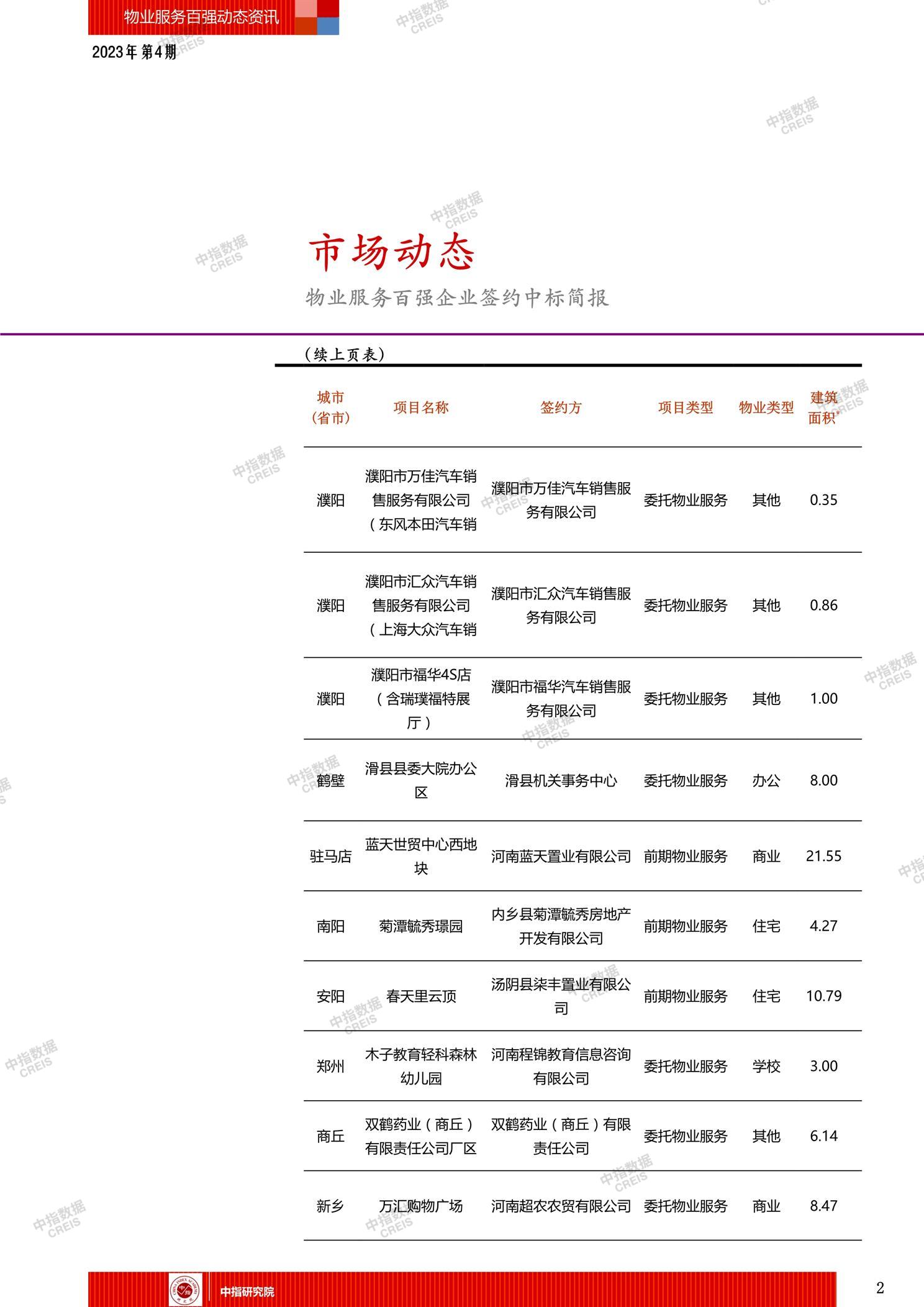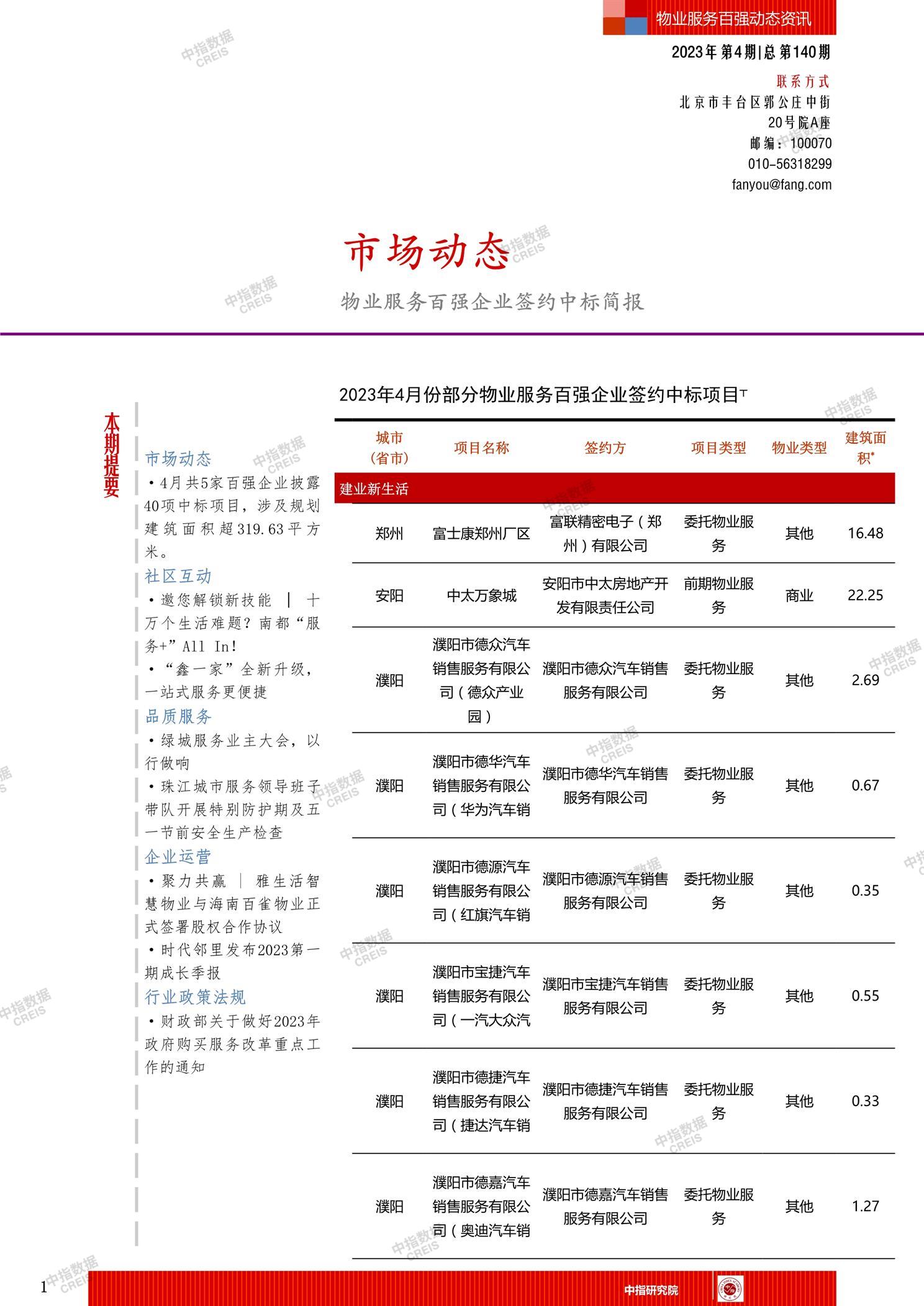 [摘要] 2023年4月物业服务百强企业动态月刊主要围绕市场动态、社区互动、品质服务及企业运营四大板块展开。在市场动态方面,4月共有5家百强企业披露40项中标项目,涉及规划建筑面积超319.63万平方米,项目类型涵盖住宅、商业、办公、学校等多种业态,其中建业新生活、宝石花物业等企业在河南、河北、青海等地签约多个委托及前期物业服务项目。社区互动方面,多家企业通过便民活动、公益捐赠、读书日、市集等形式增强业主参与感,如南都物业推出“服务+”多元增值服务,弘阳服务开展“幸福市集”,德信服务组织雨季防汛准备等。品质服务板块聚焦服务升级,绿城服务通过业主大会收集并整改102项问题,珠江城市服务开展安全生产检查,敏捷物业推进垃圾分类,新希望服务完成多个项目集中交付。企业运营方面,雅生活与百雀物业、宝石花物业与西南石油大学达成战略合作,银城生活、苏宁银河物业、弘阳服务等多家企业荣膺2023中国物业服务百强企业称号,部分企业排名提升至TOP20以内。此外,财政部发布政府购买服务改革工作通知,行业政策环境持续优化。整体来看,百强企业通过市场拓展、服务创新、社区共建及战略合作,持续提升综合竞争力与品牌影响力。 【此内容为AI自动生成】