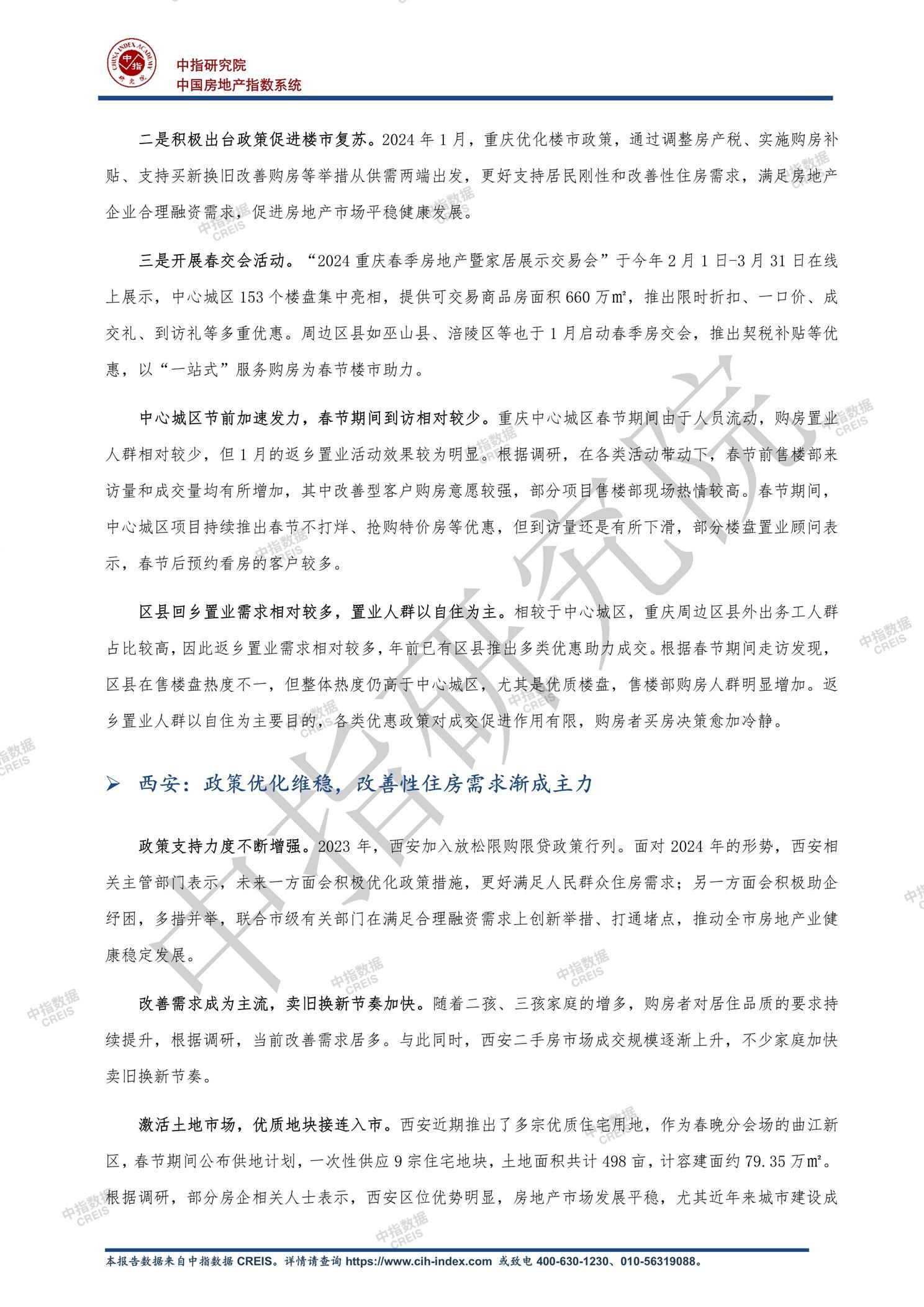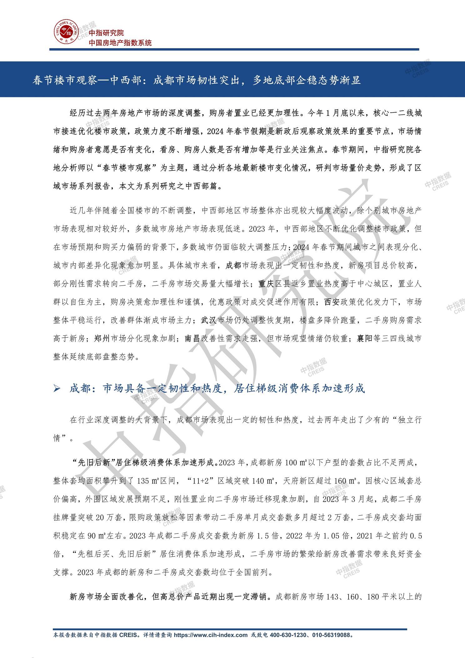 [摘要] 中指研究院2024年春节楼市观察报告显示,中西部地区房地产市场呈现分化态势。成都市场韧性突出,二手房成交活跃,2023年成交量达新房1.5倍,形成"先旧后新"的梯级消费体系,但新房高总价产品出现滞销。重庆区县返乡置业需求相对旺盛,但优惠政策对成交促进作用有限。西安改善性需求渐成主力,土地市场优质地块供应增加。武汉二手房成交量首次超过新房,市场处于调整恢复期。郑州市场分化加剧,现房销售项目增多,刚需客户更青睐二手房。南昌改善性需求走强,但政府补贴到期后观望情绪加重。襄阳等三四线城市延续底部盘整态势,购房补贴力度加大。整体来看,中西部楼市在政策优化背景下,部分城市显现企稳迹象,但市场分化明显,购房者决策更趋理性。 【此内容为AI自动生成】