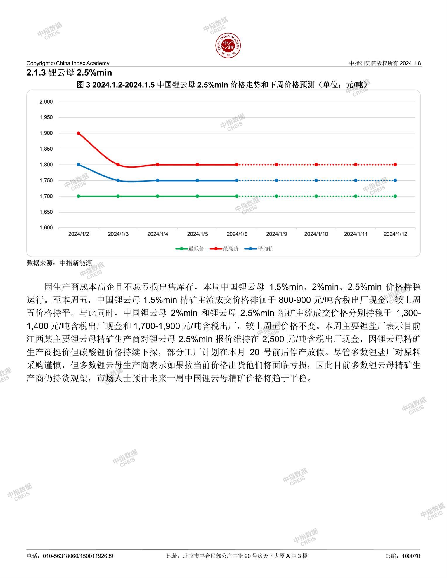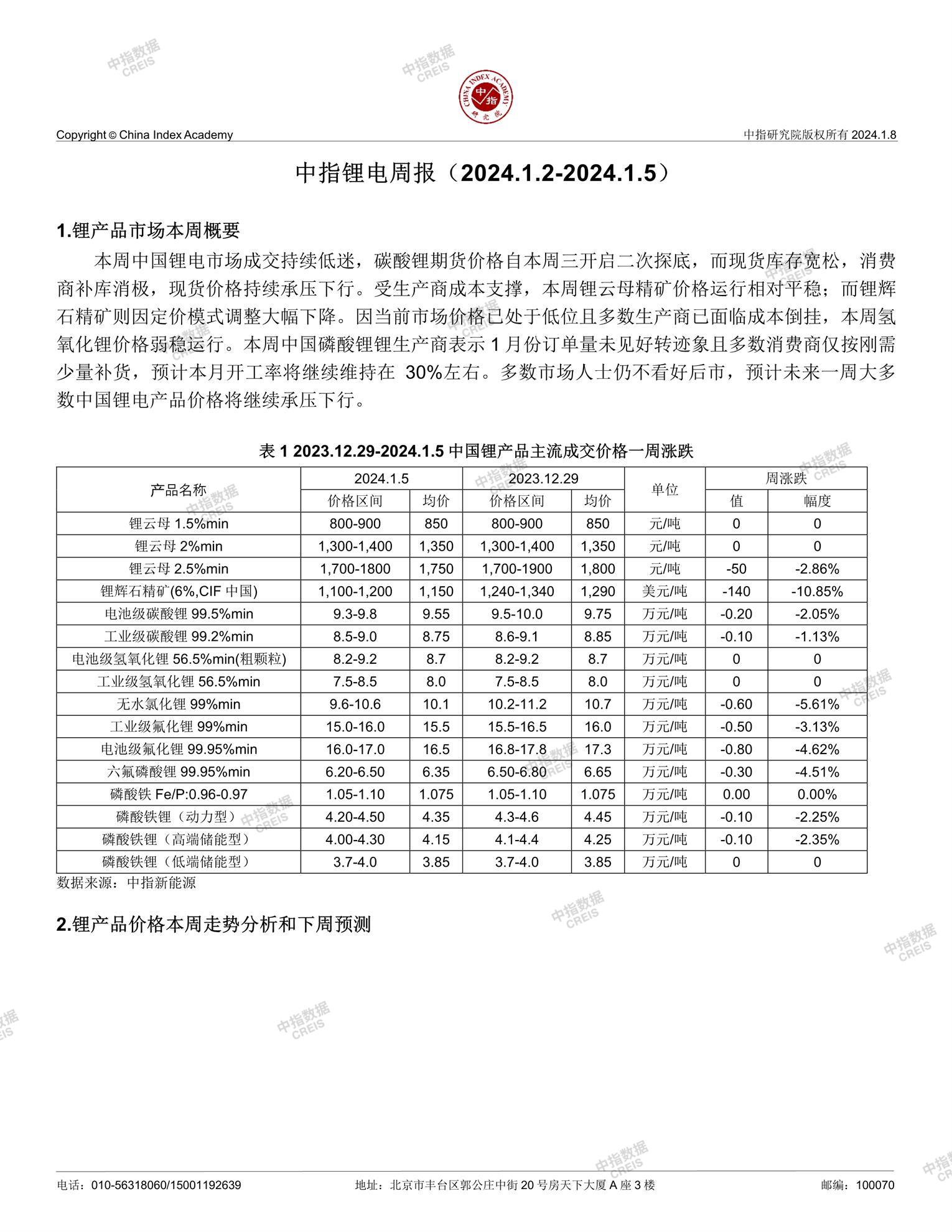 [摘要] 本周中国锂电市场成交持续低迷,碳酸锂期货价格自本周三开启二次探底,而现货库存宽松,消费 商补库消极,现货价格持续承压下行。受生产商成本支撑,本周锂云母精矿价格运行相对平稳;而锂辉 石精矿则因定价模式调整大幅下降。因当前市场价格已处于低位且多数生产商已面临成本倒挂,本周氢 氧化锂价格弱稳运行。本周中国磷酸锂锂生产商表示 1 月份订单量未见好转迹象且多数消费商仅按刚需 少量补货,预计本月开工率将继续维