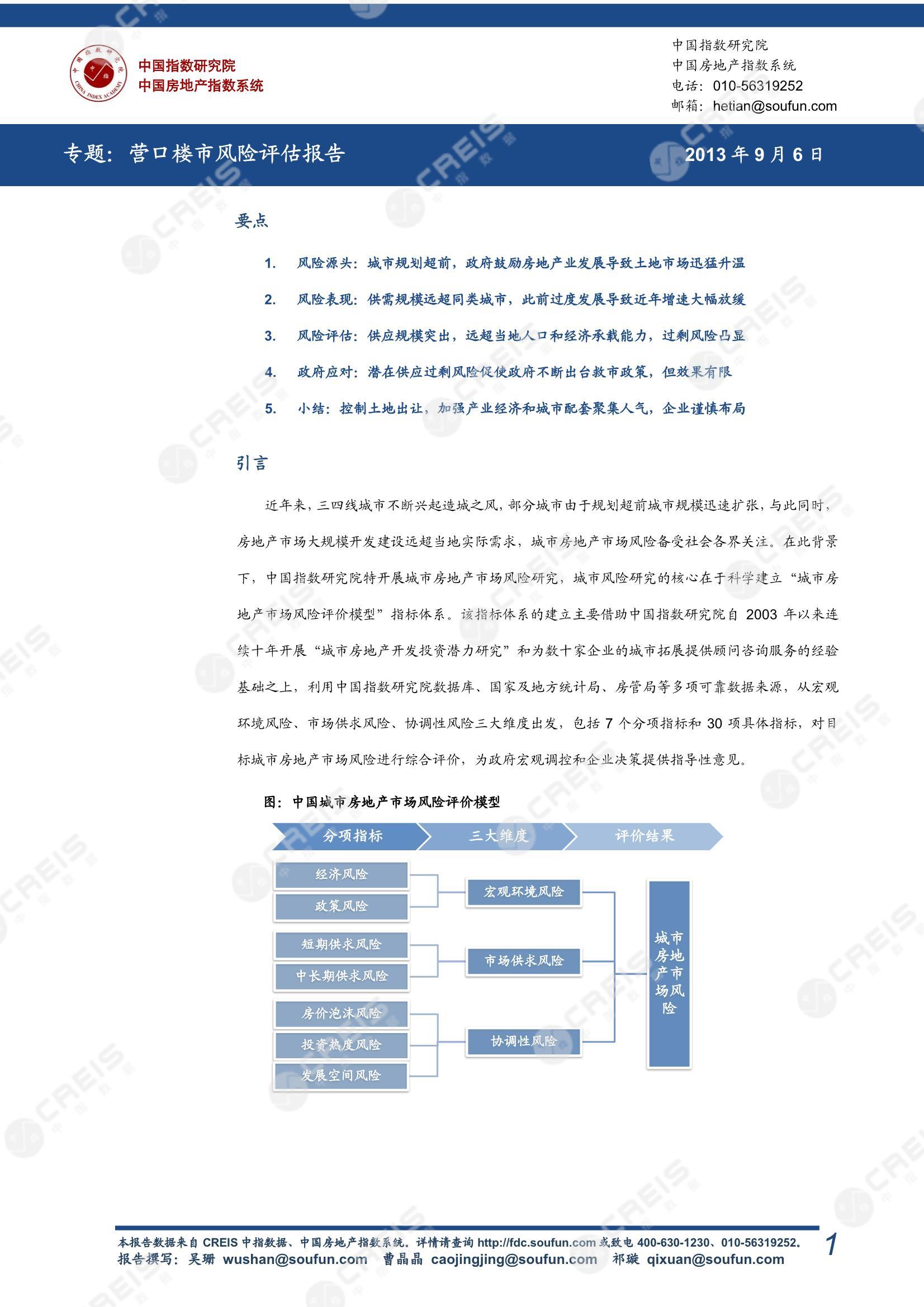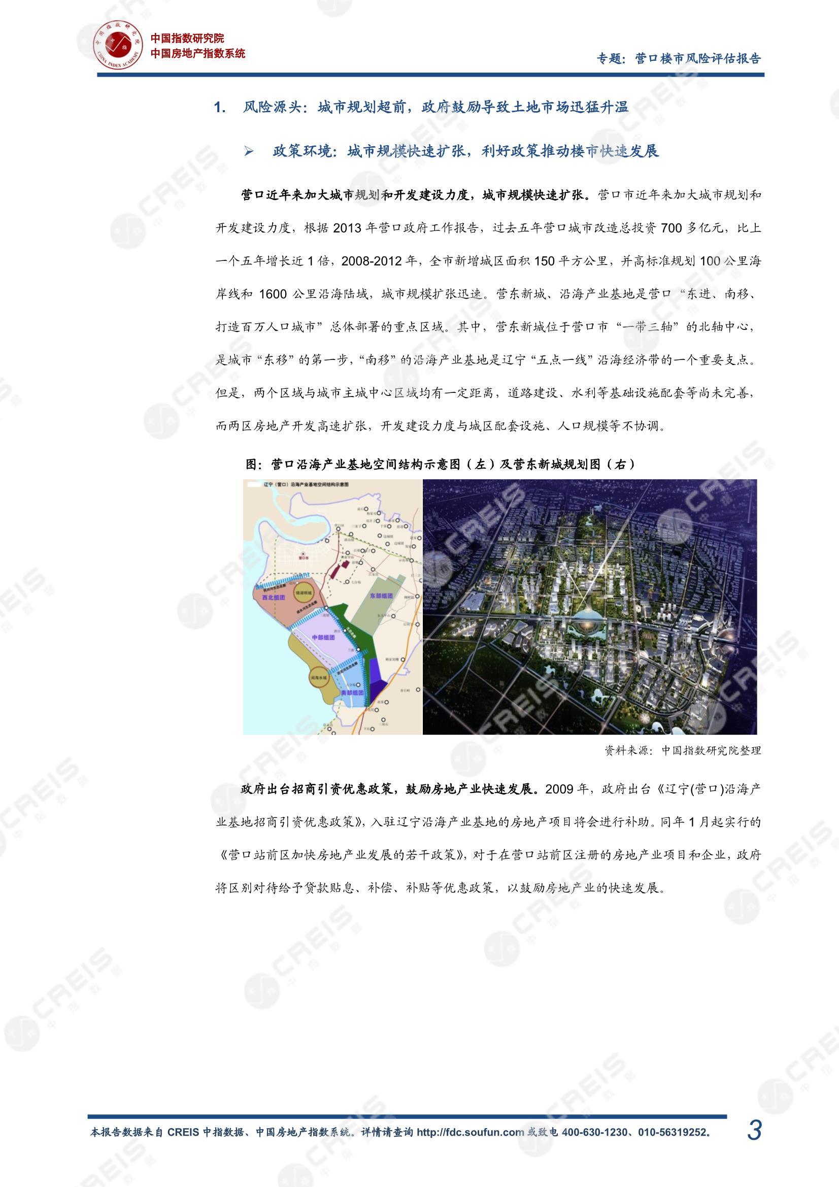 [摘要] 近年来,三四线城市不断兴起造城之风,部分城市由于规划超前城市规模迅速扩张,与此同时,房地产市场大规模开发建设远超当地实际需求,城市房地产市场风险备受社会各界关注。在此背景下,中国指数研究院建立“城市房地产市场风险评价模型”,从宏观环境风险、市场供求风险、协调性风险三大维度对目标城市房地产市场风险进行综合评价。本次研究对象是营口市,主要结论如下: 1. 风险源头:城市规划超前,政府鼓励房地产业发展导致土地市场迅猛升温 2.风险表现:供需规模远超同类城市,此前过度发展导致近年增速大幅放缓 3.风险评估:供应规模突出,远超当地人口和经济承载能力,过剩风险凸显 4.政府应对:潜在供应过剩风险促使政府不断出台救市政策,但效果有限 5.小结:控制土地出让,加强产业经济和城市配套聚集人气,企业谨慎布局