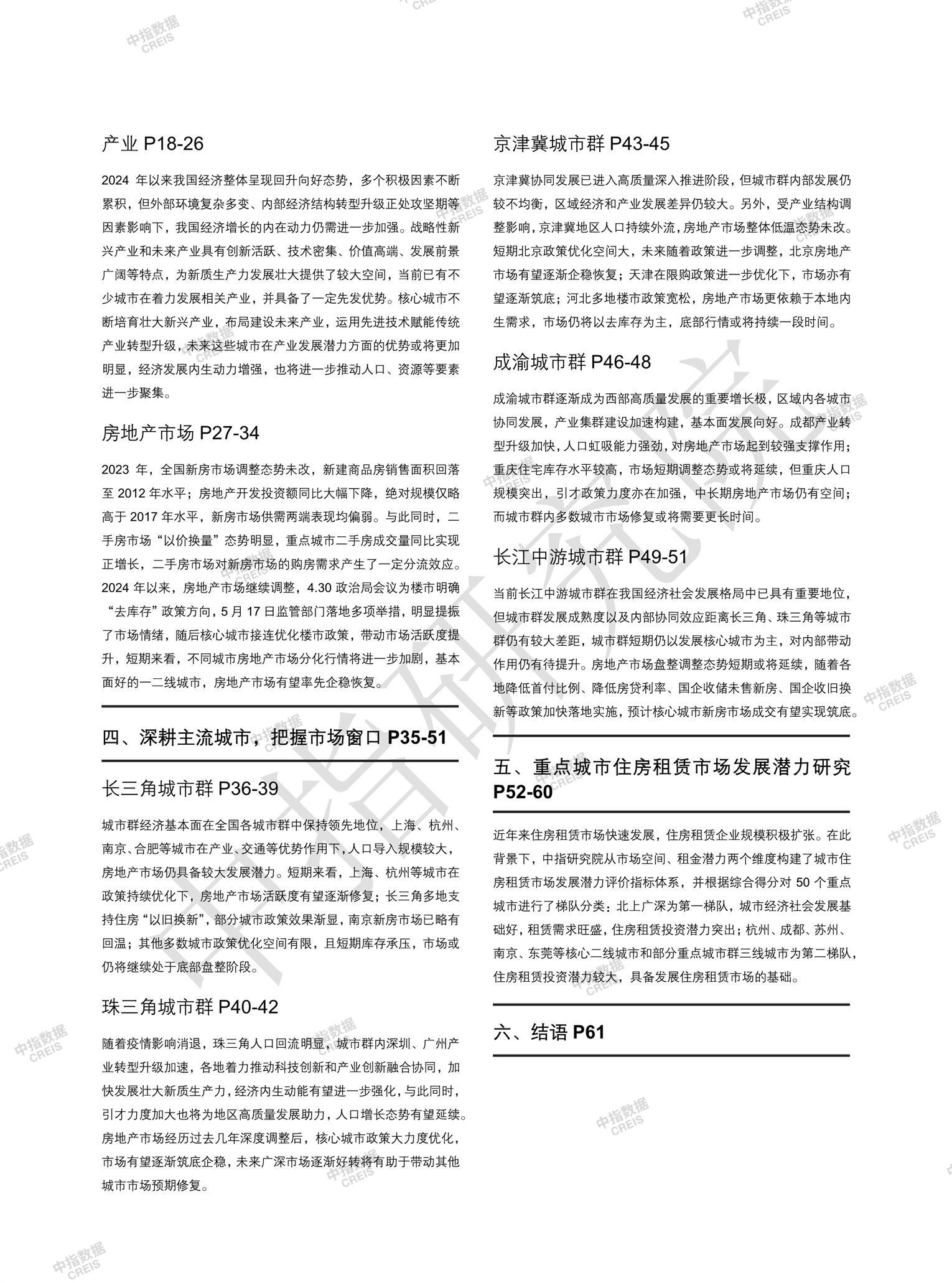 [摘要] 2024年中国地级以上城市房地产开发投资吸引力研究报告显示,2023年中国经济有所改善但对全球贡献率达32%,房地产作为支柱产业对宏观经济稳定至关重要。尽管下半年政策加码,市场仍处调整态势,2024年4.30政治局会议转向“去库存”,5.17新政提振信心但效果持续性不足。长三角城市群经济持续提升,人口增长显著如合肥、杭州、上海,核心城市市场有望企稳。珠三角制造业恢复明显,广州、深圳政策优化带动市场预期修复,二手房活跃度提升。京津冀产业协作成效显著,北京研发与津冀制造协同增强,北京政策有优化空间,天津需求存增量,河北以去库存为主。成渝城市群中成都市场韧性较强,重庆面临调整压力。长江中游城市群核心城市如武汉、长沙、南昌引领发展,新房市场处底部阶段,政策落地有望筑底。整体来看,各城市群发展不均衡,核心城市政策放松对市场信心恢复作用明显,但多数地区仍面临去库存压力。 【此内容为AI自动生成】