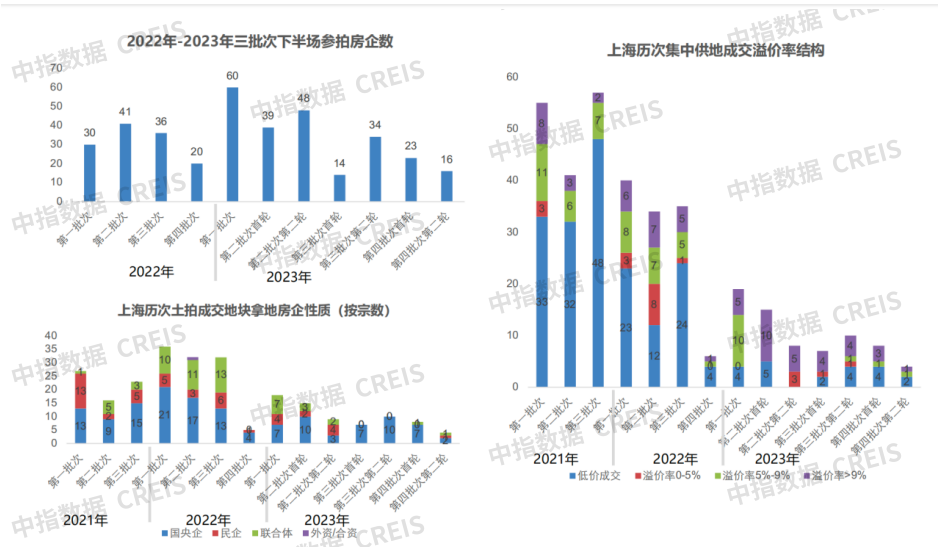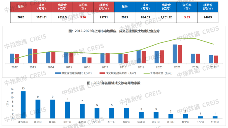上海政策楼市全面松绑,降利率降首付,调整普宅认定标准,“认房不认贷”,特殊片区定向微调 土地市场涉宅用地-年度走势:2023年上海总计成交73宗涉宅地,总建面894.03万方, 溢价率受及优质地块供应占比提升影响,上升至5.83% 市场监测:https://www.cih-index.com/土地市场——四批次第二轮参拍房企相比上轮有所......