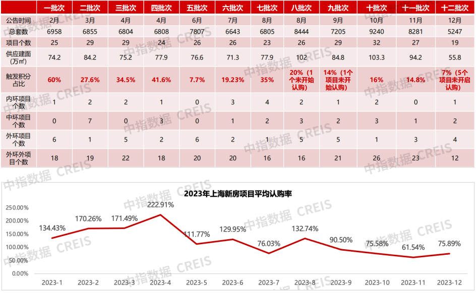 2023年上海新房共供应12批次,供应批次及项目数量均有所上升,市场认购热情全年呈先上升再下降的趋势,年末仍处于底部