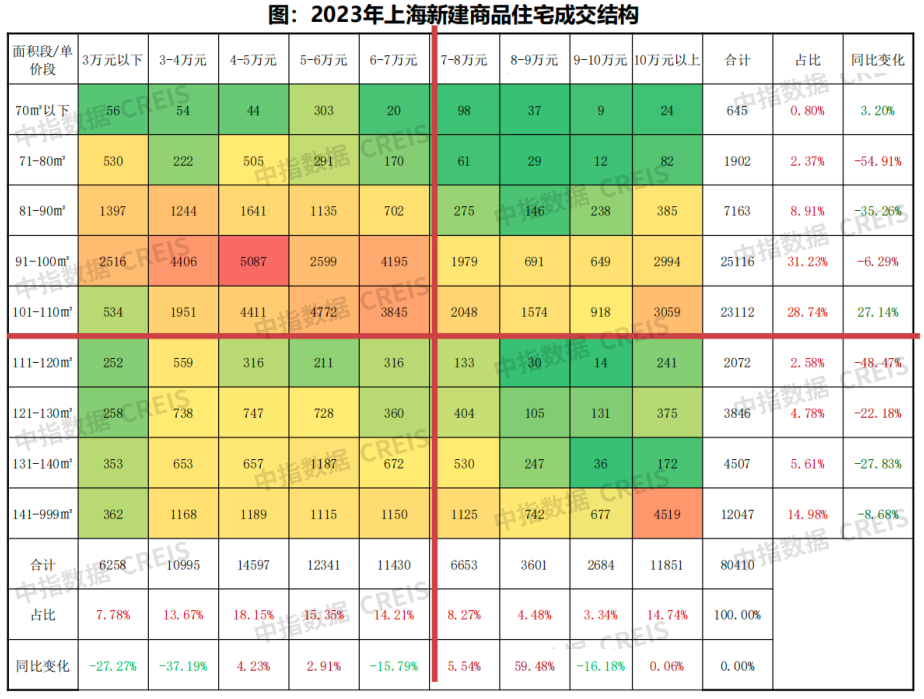通过2023年上海全市新房成交结构,可以发现:2023年的客群结构中置业门槛有所提高。主力面积段进一步向90-120㎡集中、主力单价段进一步向7-8万元/㎡集中。