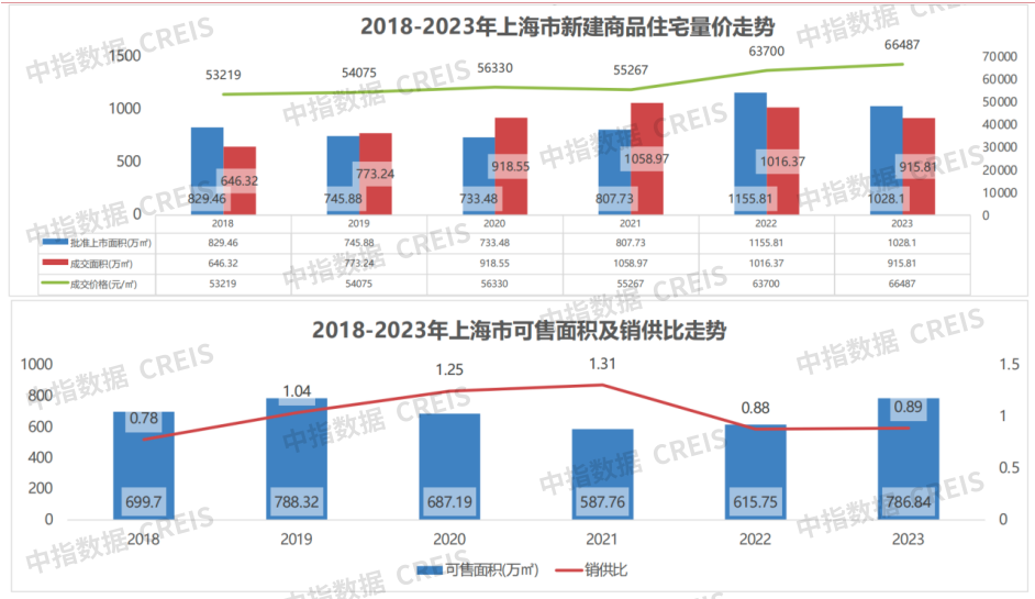 2023年上海新房市场供应面积达1028.1万㎡,同比小幅下降11%,成交面积达915.81万㎡,同比小幅下降9.9%,均价上涨4.4%
