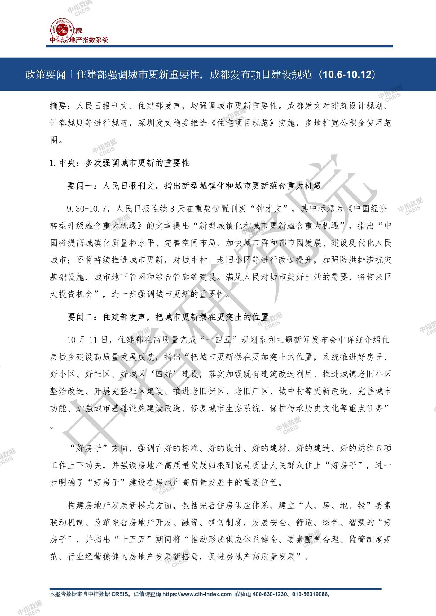 中指政策要闻丨住建部强调城市更新重要性,成都发布项目建设规范(10.6-10.12)