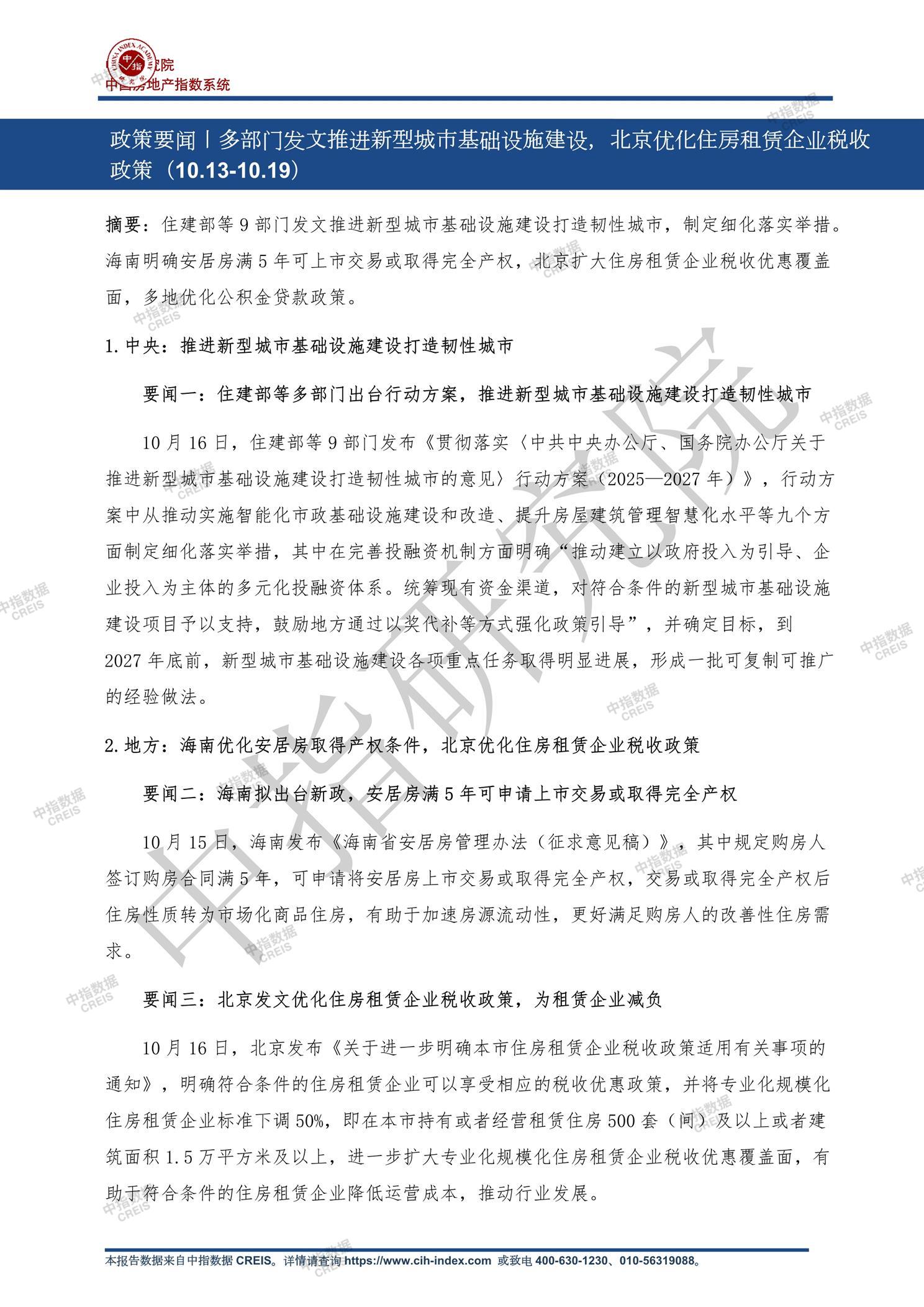 中指政策要闻丨多部门发文推进新型城市基础设施建设,北京优化住房租赁企业税收政策(10.13-10.19)