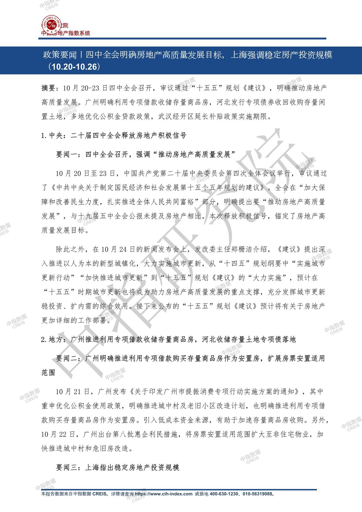 中指政策要闻丨四中全会明确房地产高质量发展目标,上海强调稳定房产投资规模(10.20-10.26)