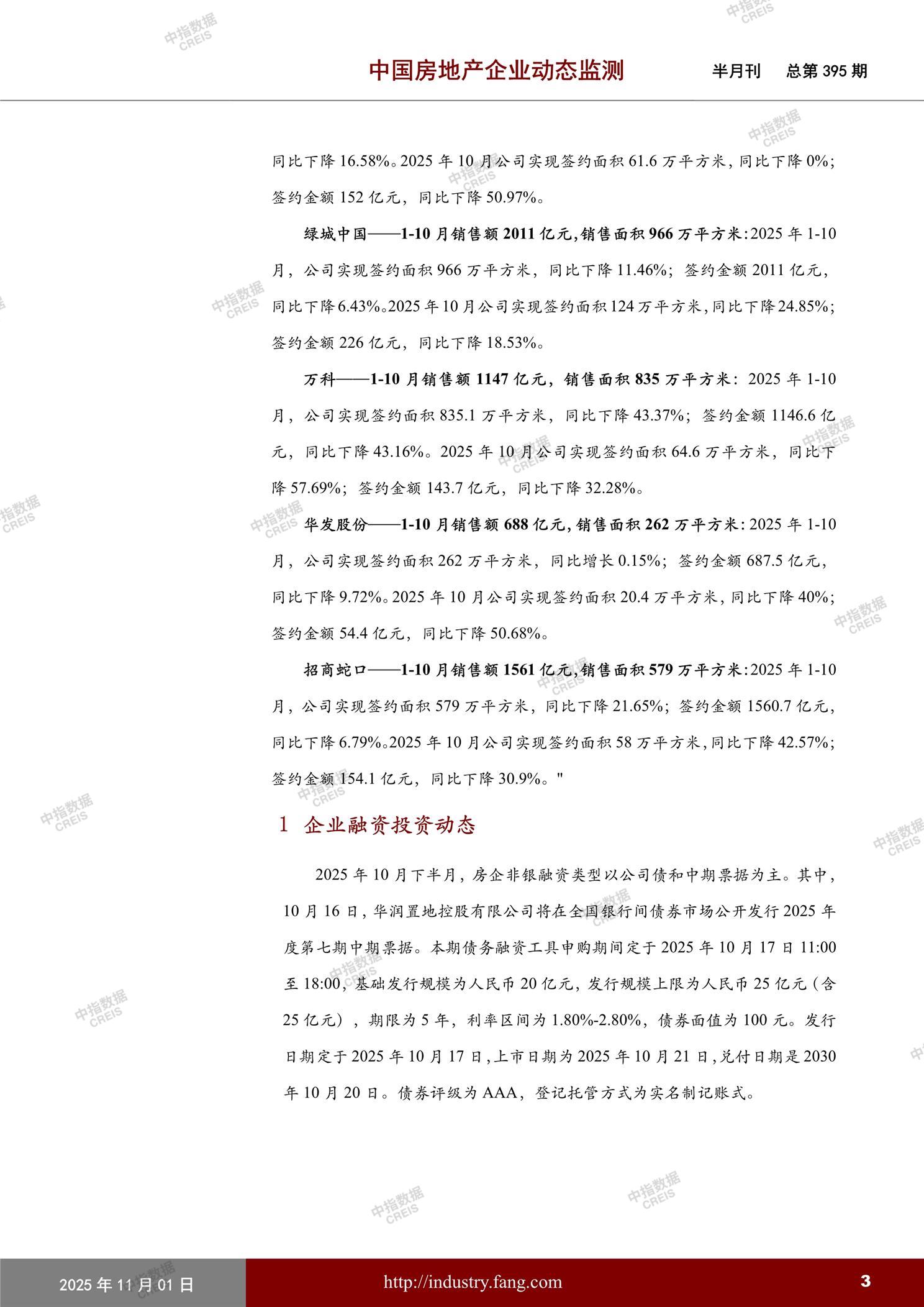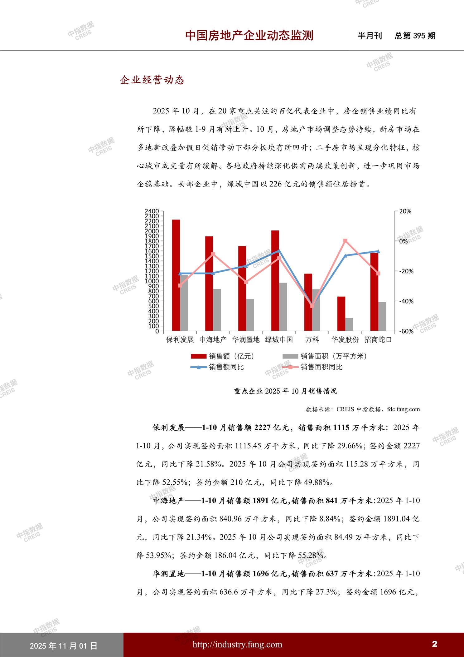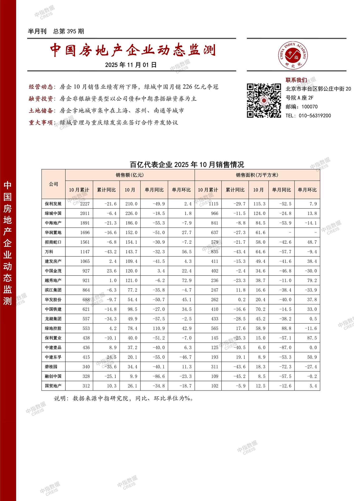 [摘要] 2025年10月中国房地产企业动态监测显示,房企销售业绩普遍同比下降,绿城中国以226亿元单月销售额居首。重点房企1-10月累计销售额同比降幅明显,如保利发展下降21.6%、万科下降43.2%。融资方面,房企以公司债和中期票据为主,华润置地发行25亿元中期票据,利率1.8%-2.8%。土地市场聚焦上海、苏州等城市,中海地产以44.7亿元竞得上海徐汇住宅地块。重大事项包括绿城管理与重庆绿发实业合作开发璧山项目,远洋建管签约中山代销服务。整体市场仍处调整期,但核心城市优质地块保持热度。 【此内容为AI自动生成】