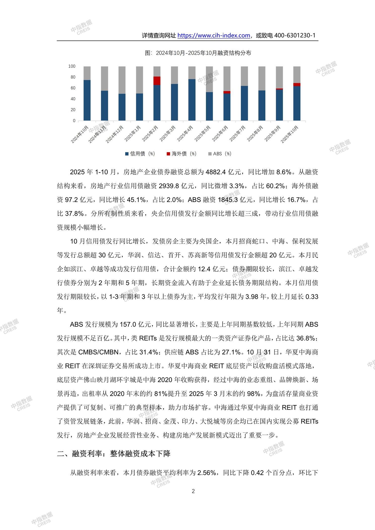 [摘要] 2025年10月中国房地产企业融资监测月报显示,当月房地产行业债券融资总额达512.4亿元,同比增长76.9%,主要得益于信用债和ABS的显著增长。信用债融资327亿元占比63.8%,ABS融资157亿元同比激增115.8%。融资成本持续下降,整体平均利率为2.56%,同比下降0.42个百分点。央国企主导发债,招商蛇口以45亿元发行额居首,苏高新1.84%的利率最低。资本市场动态方面,华侨城、大悦城等企业获得新增资金,金科股份获重整投资人2.5亿借款,多家房企债务重组取得进展。REITs市场扩容,华夏中海商业REIT上市为存量资产盘活提供样本。 【此内容为AI自动生成】