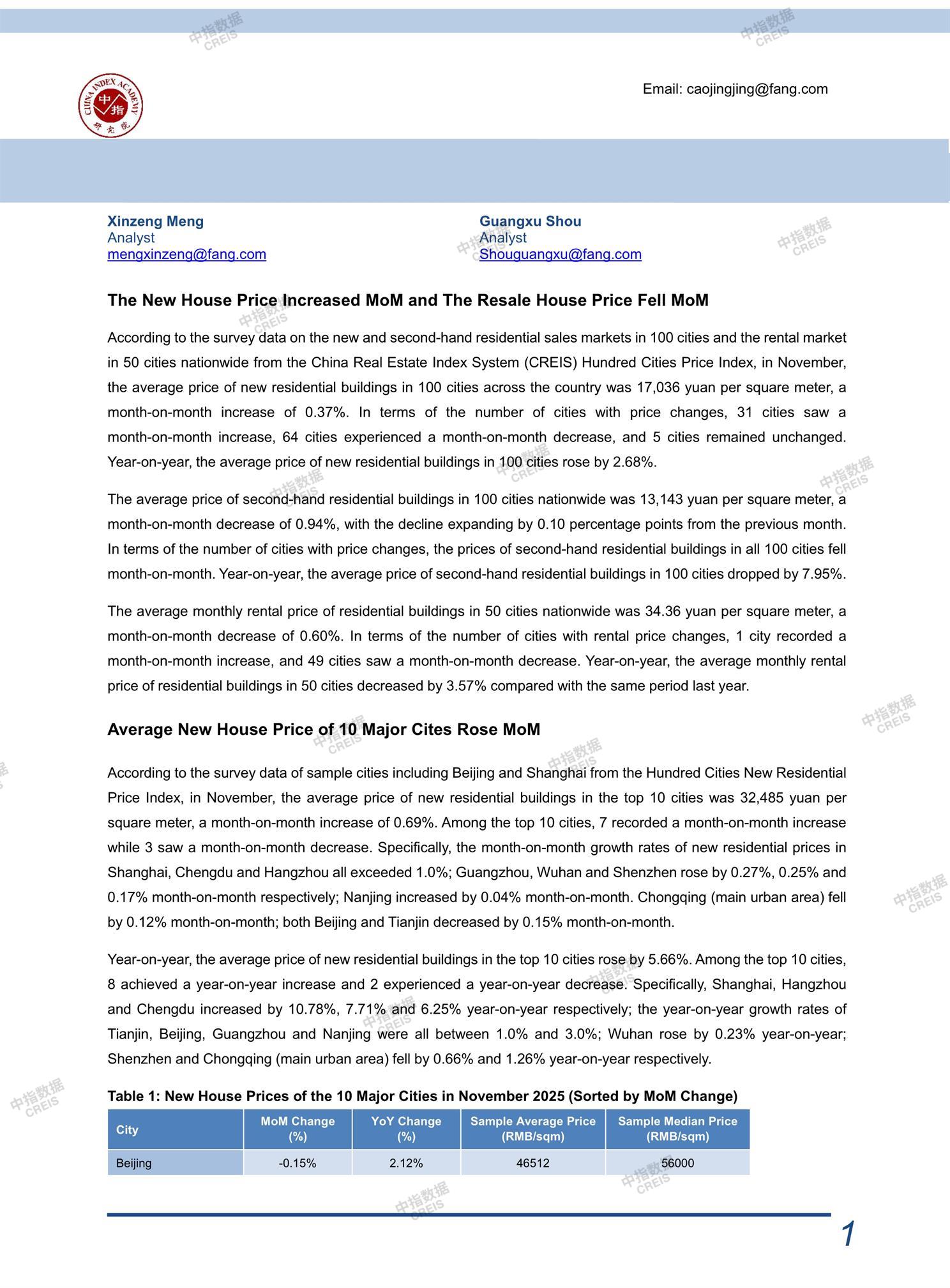 [摘要] 2025年11月中国百城住宅价格指数显示,全国新建住宅均价环比上涨0.37%至17036元/平方米,其中31城上涨、64城下跌;同比上涨2.68%。十大城市新建住宅均价环比上涨0.69%,上海、成都、杭州涨幅超1%。二手住宅市场整体疲软,百城均价环比下跌0.94%至13143元/平方米,所有城市均环比下跌,同比跌幅达7.95%。十大城市二手住宅均价环比下跌1.17%,南京、武汉等城市跌幅超1.2%。租赁市场方面,50城住宅租金环比下降0.60%至34.36元/平方米/月,仅1城租金环比上涨,同比下跌3.57%。北京、深圳、上海租金水平位居前三,但均呈现环比下跌趋势。 【此内容为AI自动生成】
