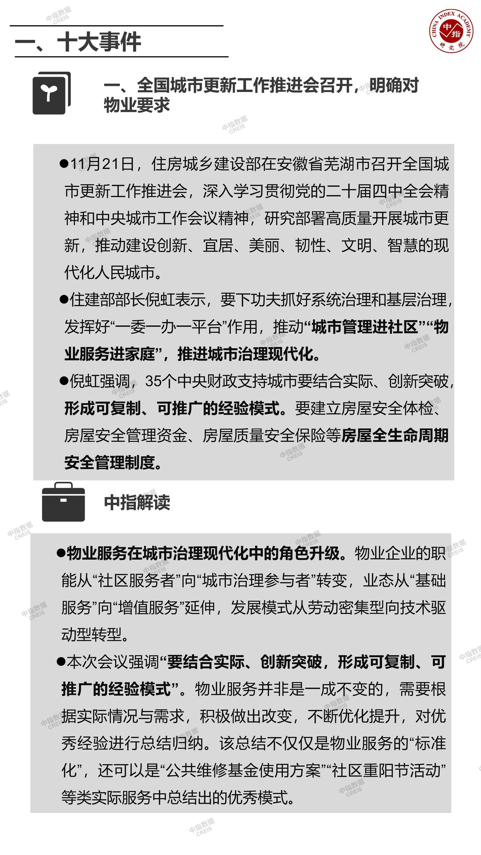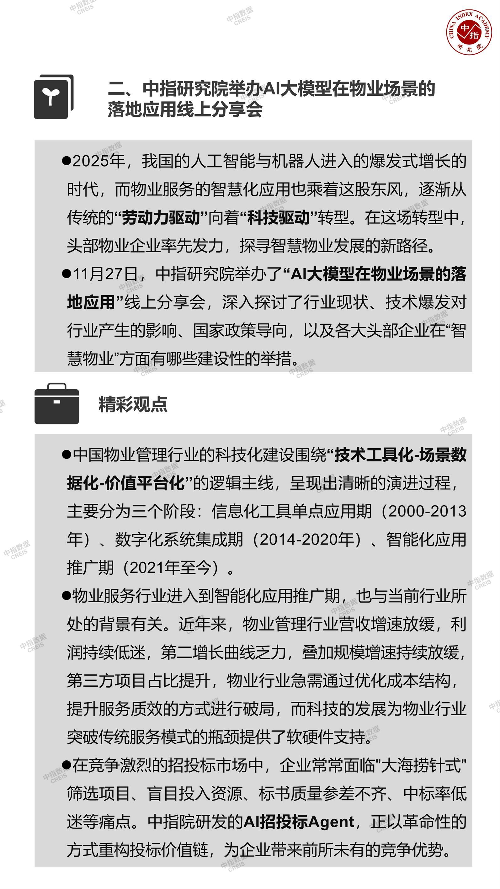 [摘要] 2025年11月物业管理行业呈现多元化发展趋势。政策层面,住建部推动物业参与城市治理现代化,发改委强化招标规范及智慧社区建设,国务院安委会部署高层建筑消防整治。行业动态上,头部企业如碧桂园服务、华润万象生活通过第三方拓展和关联方承接持续扩张规模,智慧物业转型加速,中指研究院举办AI大模型应用分享会探讨技术落地。企业实践中,龙湖、南都等物业公司开展适老化服务、消防演练及社区文化活动,提升服务温度。资本市场方面,部分物企股价表现亮眼,但万物云股权质押事件引发行业对独立性的关注。整体来看,行业正从基础服务向科技驱动、多元参与的综合治理方向升级。 【此内容为AI自动生成】