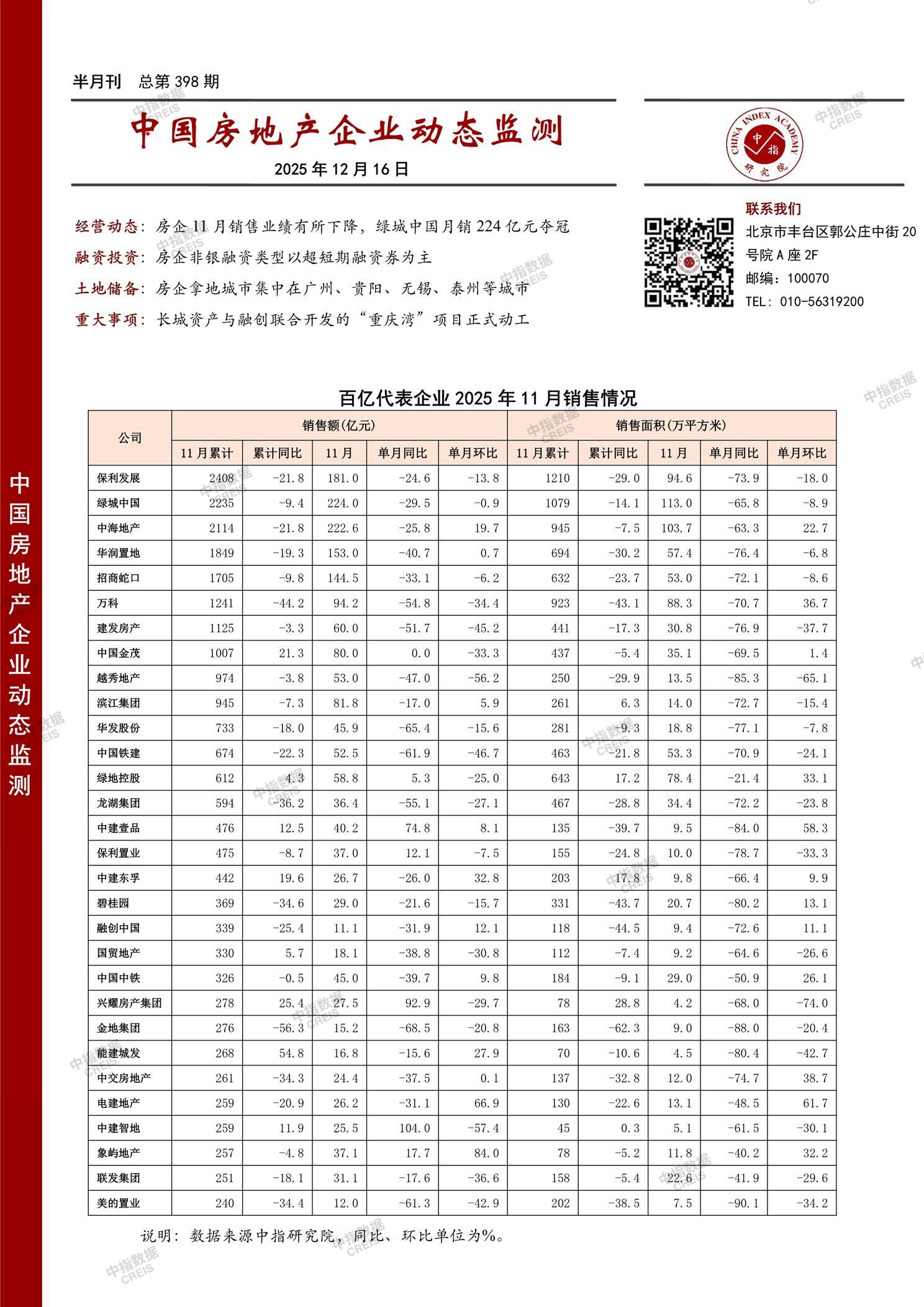 • [摘要] 经营动态:房企11月销售业绩有所下降,绿城中国月销224亿元夺冠 融资投资:房企非银融资类型以超短期融资券为主 土地储备:房企拿地城市集中在广州、贵阳、无锡、泰州等城市 重大事项:长城资产与融创联合开发的“重庆湾”项目正式动工
