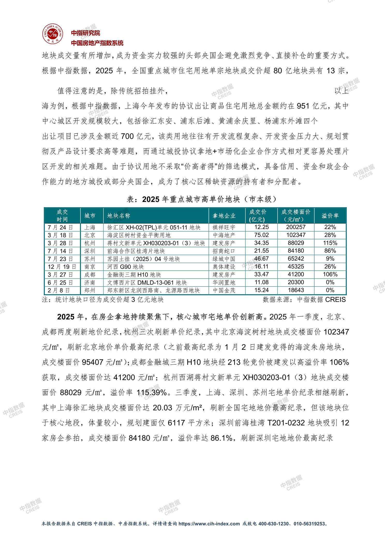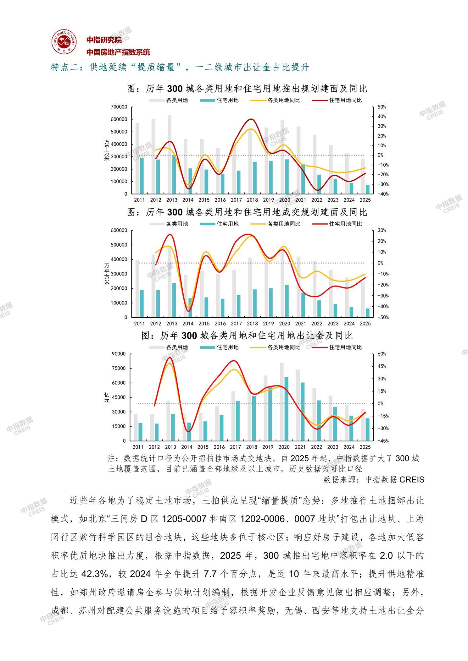 [摘要] 2025年土地市场呈现整体缩量与结构分化的特征,300城住宅用地成交规划建筑面积同比下降13.5%,出让金下降10.6%。核心城市优质地块受房企高度聚焦,如上海徐汇地块楼面价达20.03万元/㎡刷新全国纪录,北京、杭州等地单价也屡创新高。市场呈现四大特点:一是大宗地块成交量增多,协议出让成为重要方式;二是供地“提质缩量”,一二线城市出让金占比提升至57%;三是土拍热度“前高后低”,下半年核心城市供地放缓;四是央国企主导拿地,TOP10中8家为央国企,头部房企重仓上海、北京等核心城市。房企投资更注重去化能力与利润率,土地市场延续“点状高热、分化延续”态势。 【此内容为AI自动生成】
