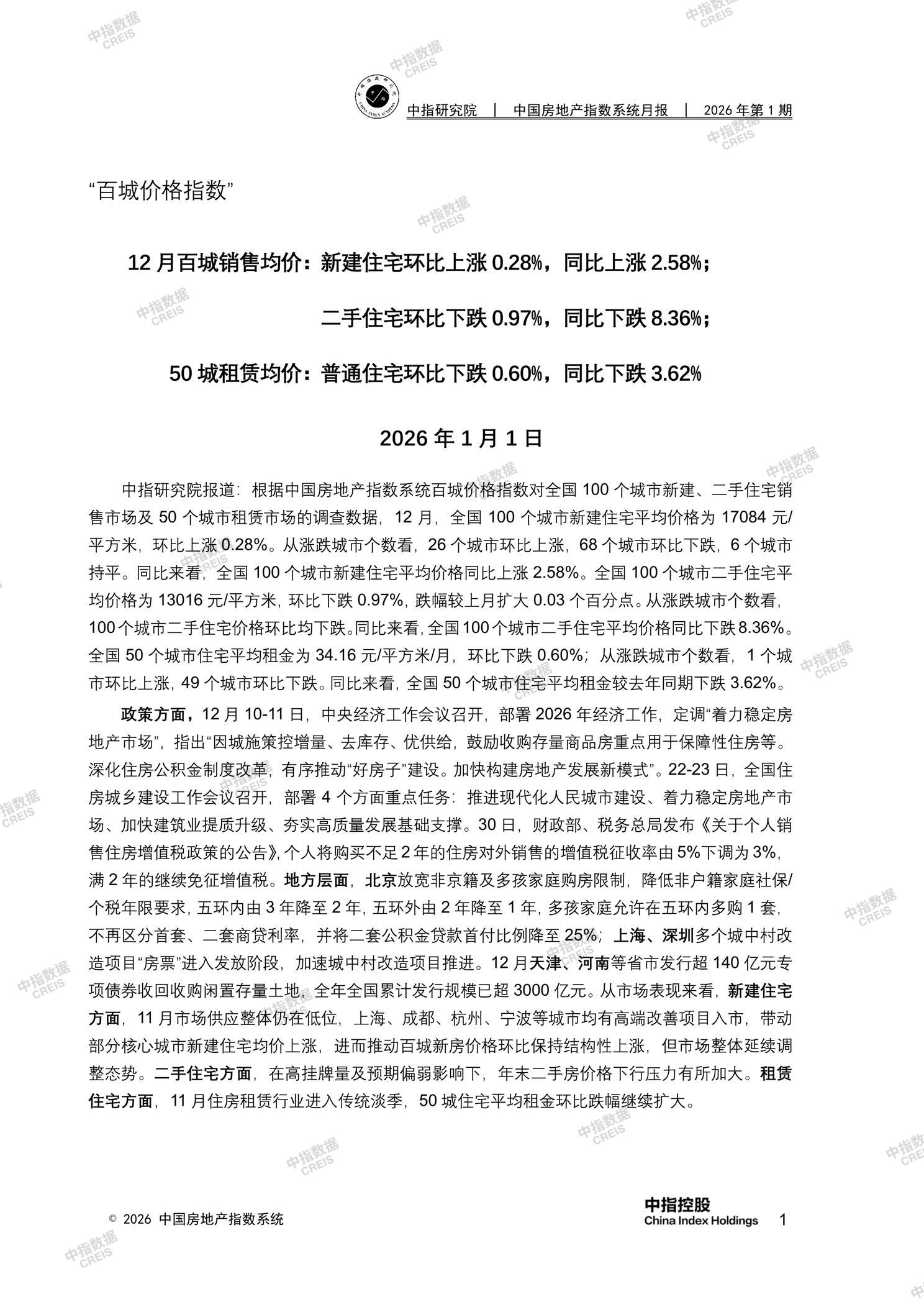 《中国房地产指数系统月报2026年第1期(总第333期)