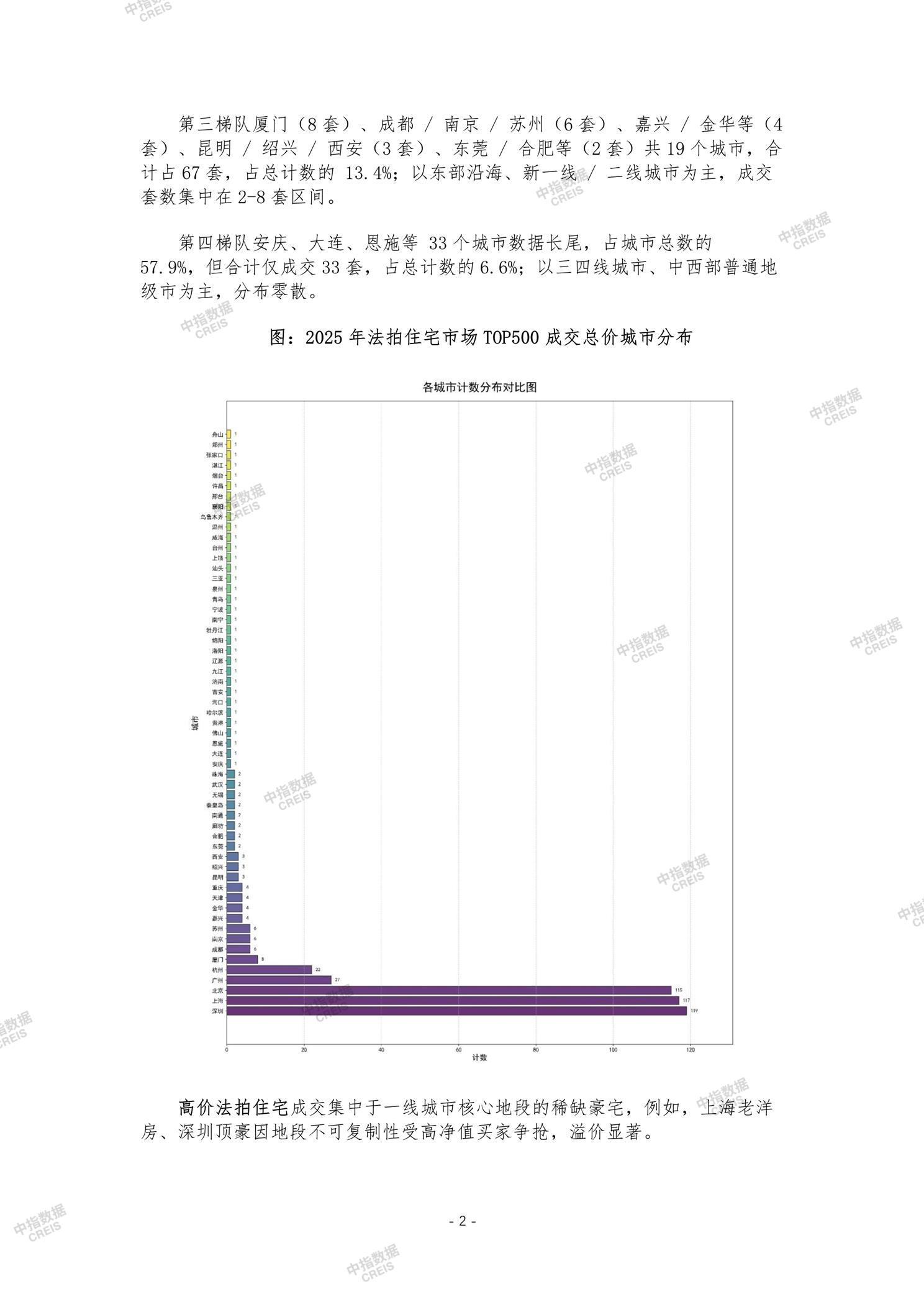 [摘要] 2025年法拍市场整体呈现量价双降趋势,全国挂拍量同比下降6.6%至71.9万套,成交16.9万套,总成交金额2536.2亿元,平均折价率74.1%。高价法拍房高度集中于北上深三城,占TOP500房源的70.2%,核心区域稀缺豪宅因地段优势受追捧。住宅法拍成交占比51.9%,一线城市均价达36196元/㎡,显著高于三四线的4750元/㎡。市场结构上二拍成交占比最高(46.9%),竞买人更倾向在价格更具吸引力的阶段出手。尽管市场调整,核心城市优质资产仍逆势受捧,显示高端需求的韧性。 【此内容为AI自动生成】