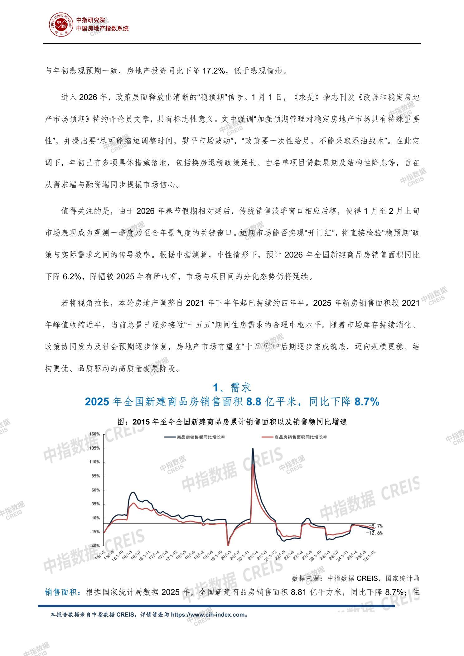 [摘要] 2025年全国房地产市场延续调整态势,商品房销售面积8.8亿平米同比下降8.7%,销售额8.4万亿元同比下降12.6%,投资、新开工和竣工面积同比分别下降17.2%、20.4%、18.1%。市场调整与企业经营压力严峻,新房销售价格承压。2026年政策释放“稳预期”信号,预计销售面积同比下降6.2%,降幅收窄,市场分化延续。中长期看,房地产市场有望在“十五五”中后期逐步筑底,迈向高质量发展阶段。 【此内容为AI自动生成】