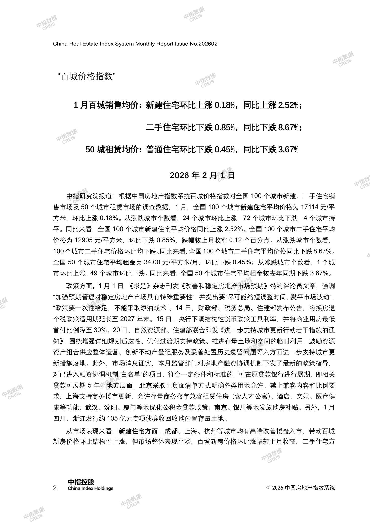 中国房地产指数系统百城价格指数报告(2026年1月)