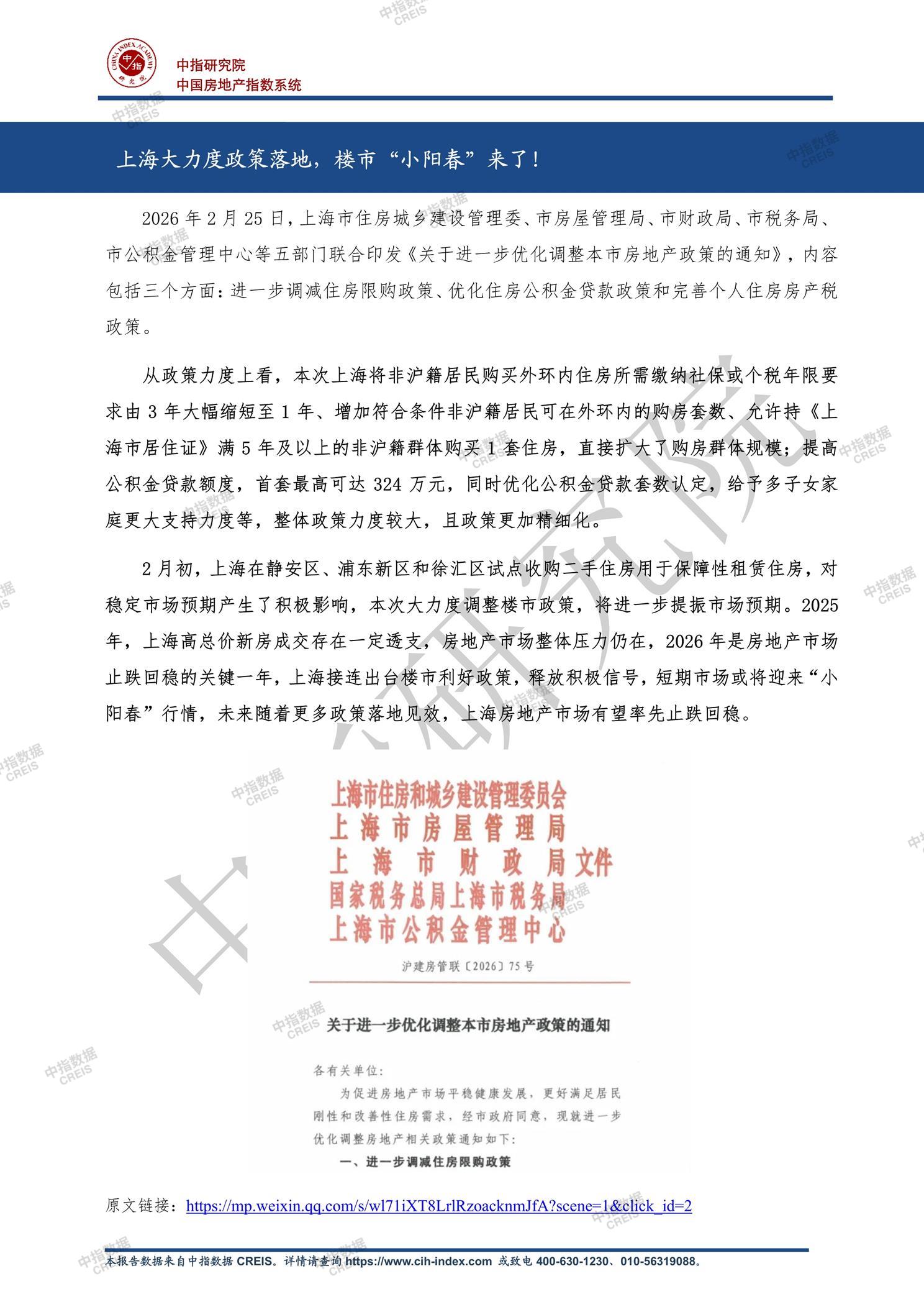 [摘要] 2026年2月25日,上海市五部门联合印发《关于进一步优化调整本市房地产政策的通知》,主要从三方面调整政策:一是大幅缩短非沪籍居民外环内购房社保/个税年限要求,由3年降至1年,并扩大持居住证满5年群体的购房资格;二是提高公积金贷款额度,首套最高可达324万元,并优化多子女家庭支持政策;三是完善房产税政策,对沪籍家庭成年子女唯一住房免征房产税。这些政策力度较大且精细化,旨在扩大购房群体规模、降低置业成本。报告指出,2025年上海外环内新房和二手房成交占比提升,新政将更有效稳定二手房市场。叠加2月初保障性租赁住房试点政策,上海楼市短期有望迎来“小阳春”,并率先止跌回稳。 【此内容为AI自动生成】