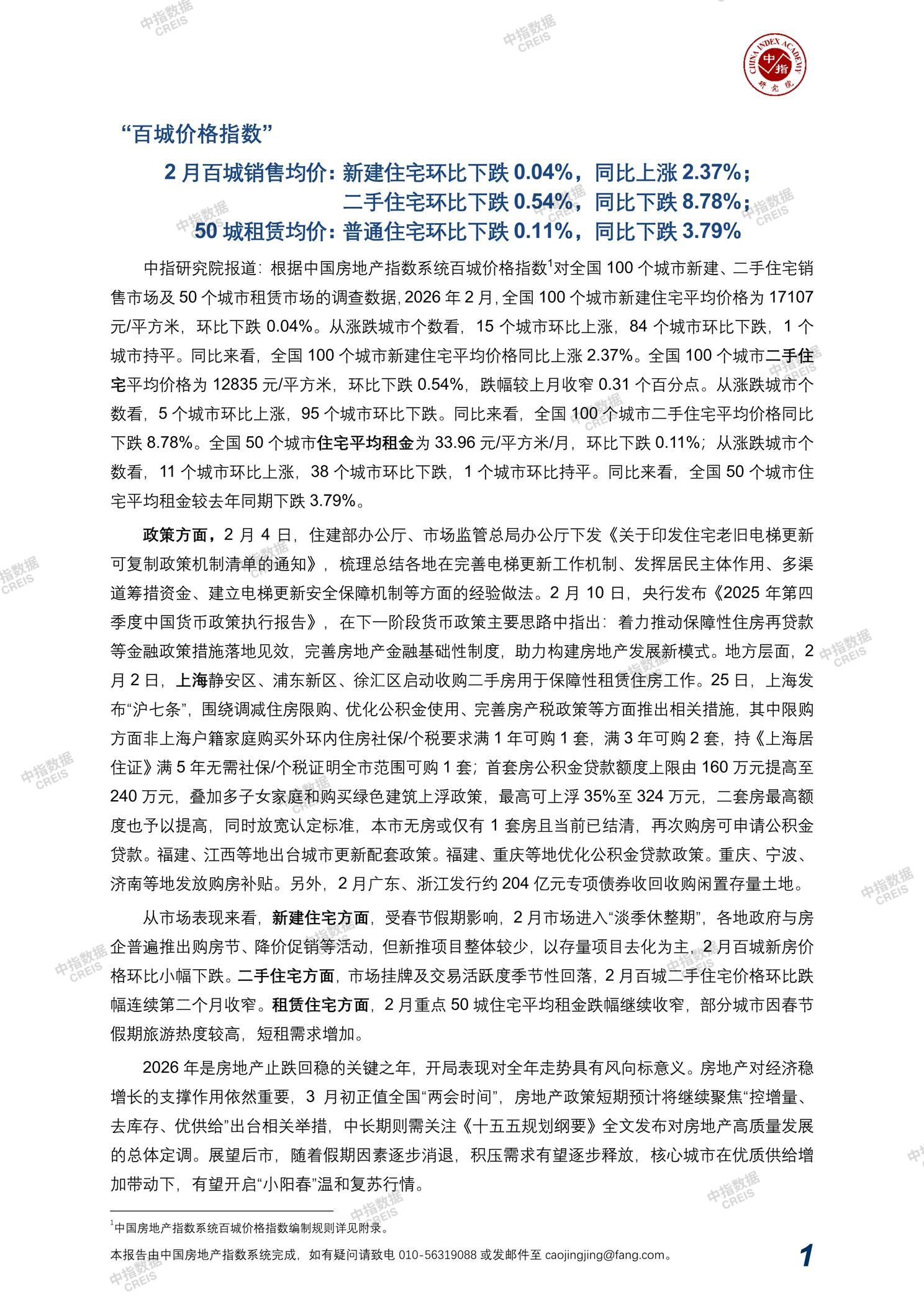 中国房地产指数系统百城价格指数报告(2026年2月)