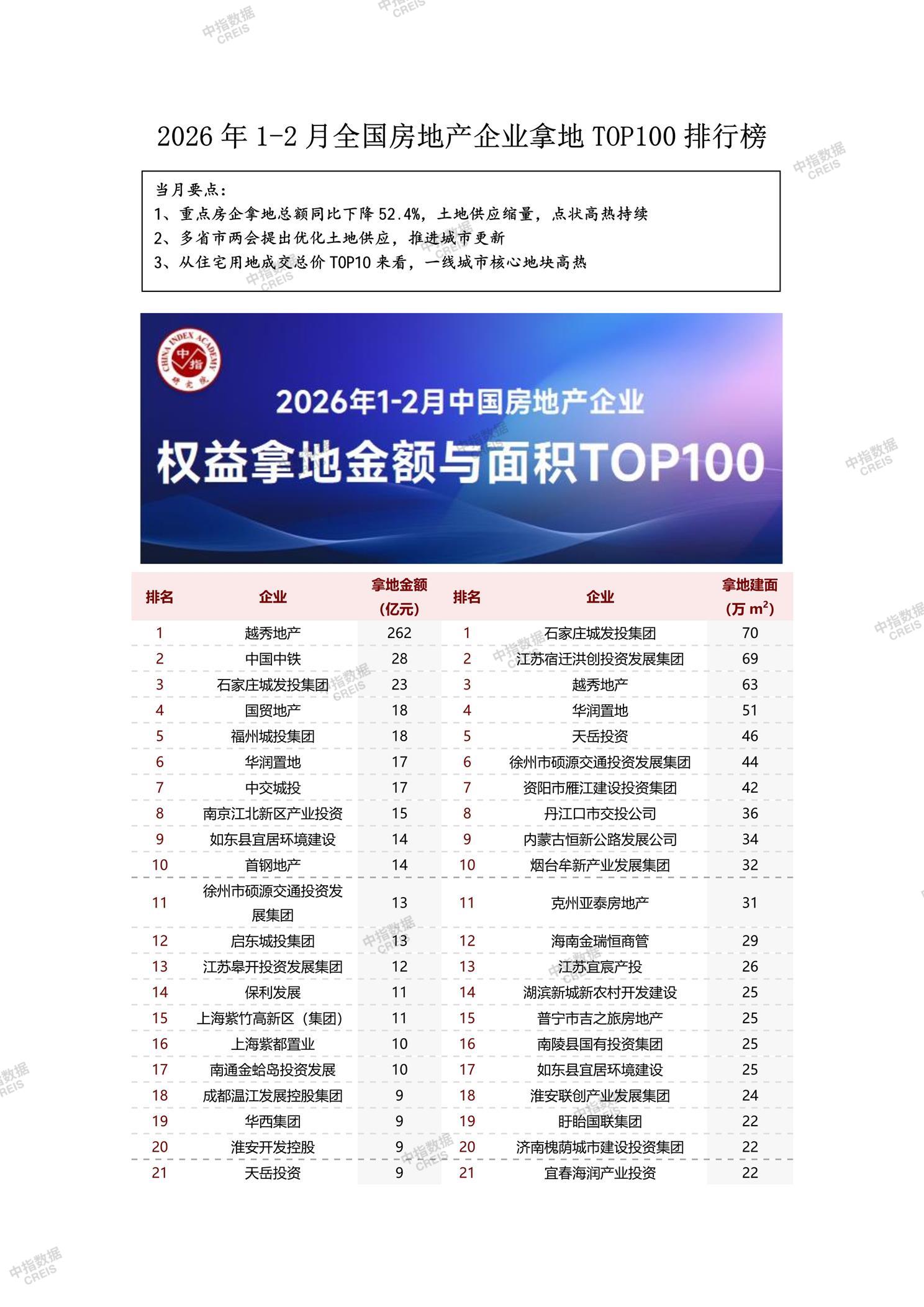2026年1月全国房地产企业拿地TOP100排行榜