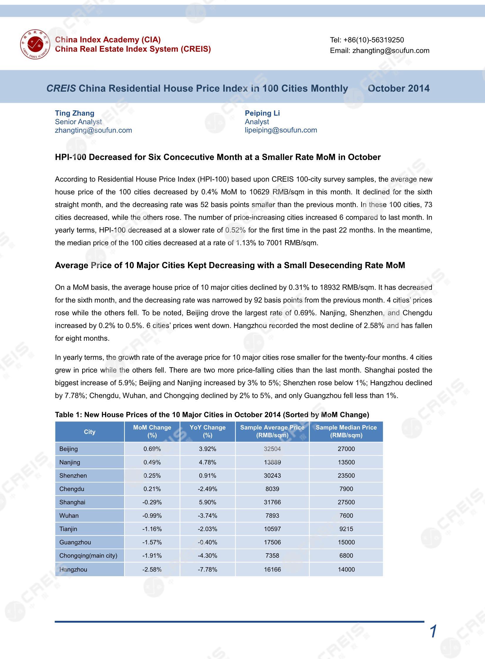 《CREIS China Residential HPI-100 Monthly (OCT 2014)》
