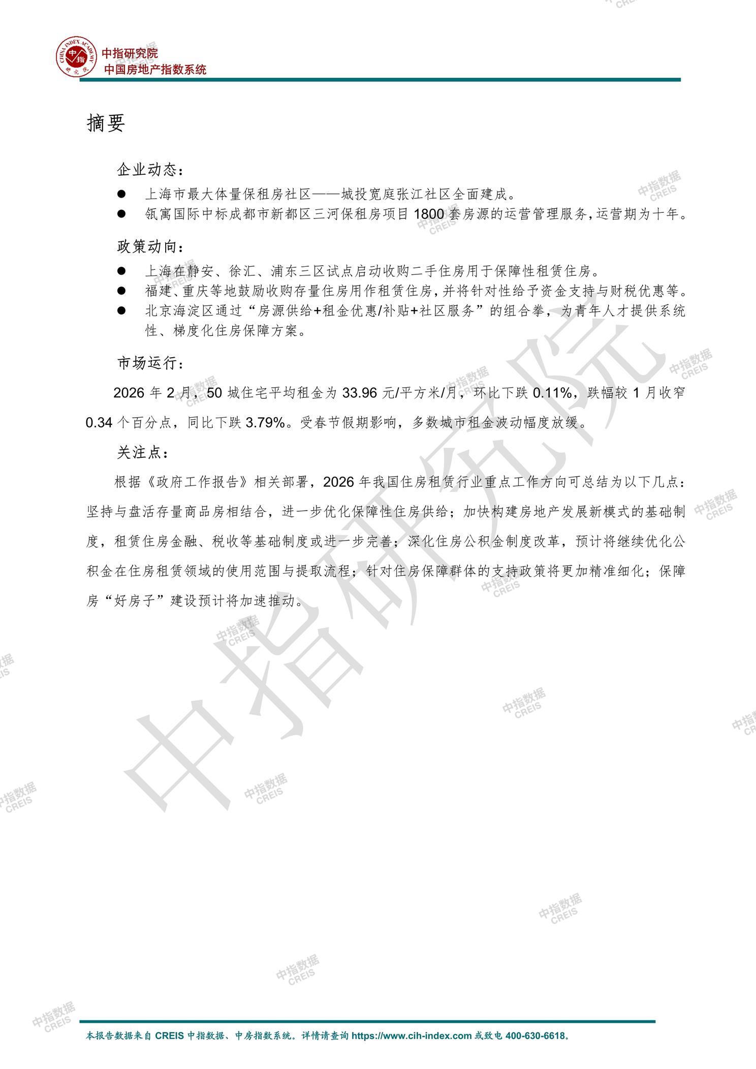 [摘要] 2026年2月中国住房租赁市场呈现以下特点:政策层面,中央及地方持续推动保障性租赁住房发展,上海、福建等地试点收购存量房转保租房,北京、成都等地推出青年人才安居补贴。市场运行上,50城住宅平均租金环比微跌0.11%至33.96元/平方米/月,同比降3.79%,春节假期使波动趋缓。企业格局中,万科泊寓以19.29万间开业规模居首,TOP30企业总开业量达143.6万间,地方国企占比提升至25%。动态方面,上海城投宽庭张江社区等保租房项目集中入市,瓴寓国际中标成都保租房运营项目,租赁ABS及REITs融资活跃,如浦开集团36.5亿元ABS获批。行业重点将围绕盘活存量房、完善基础制度、公积金改革及“好房子”建设展开。 【此内容为AI自动生成】