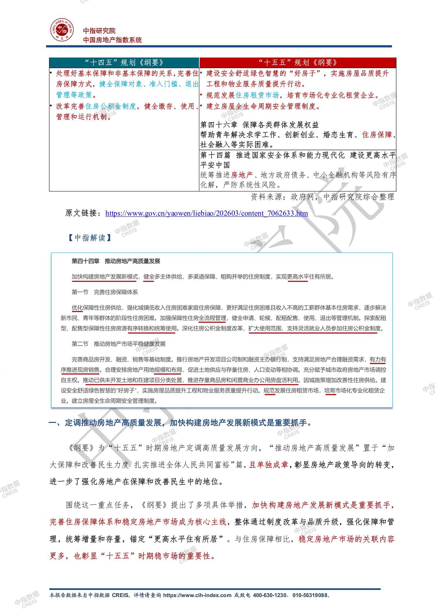 [摘要] “十五五”规划纲要中房地产地位显著提升,内容覆盖六大篇章,核心从城镇化战略转向民生保障,并新增人口发展与安全体系关联表述。政策定调“推动房地产高质量发展”,首次独立成章,细化住房保障与市场平稳健康两大方向,取消“房住不炒”等旧提法,强化因城施策、多子女家庭倾斜等实操举措。重点包括:构建房地产发展新模式,现房销售渐进推进,房屋全生命周期安全管理落地;供需协同发力,需求端与消费、人口政策结合,供给端控增量、优存量,突出“好房子”品质升级;保障房供给优化至全流程管理,公积金改革深化;城市更新强调高质量与可持续模式。整体体现行业从规模扩张转向民生保障与品质提升的新阶段。 【此内容为AI自动生成】