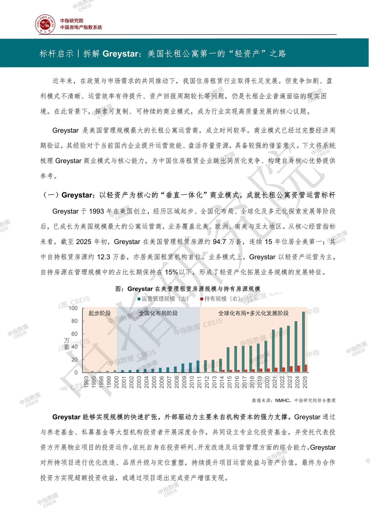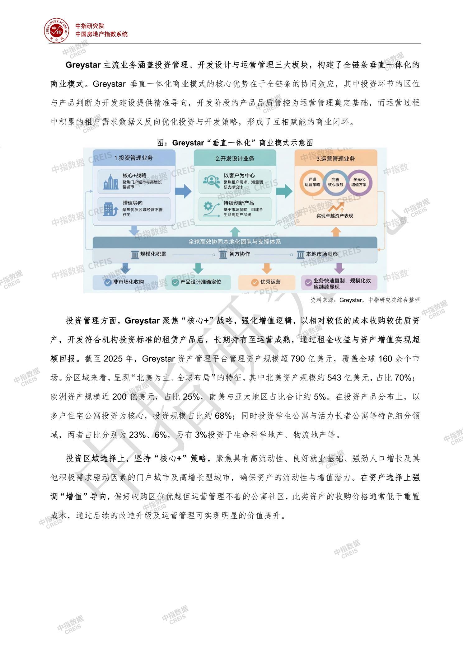 [摘要] Greystar作为美国长租公寓领域的标杆企业,通过轻资产运营和垂直一体化商业模式实现了规模快速扩张。其核心模式包括投资管理、开发建设和运营管理三大板块,形成全链条协同效应。投资方面聚焦“核心+”战略,偏好增值型资产收购;开发环节以需求导向设计多元化产品,如活力长者公寓;运营上通过标准化流程与增值服务提升效率。Greystar的竞争力源于垂直一体化能力、规模化布局和机构资本合作,形成良性循环。报告建议中国长租企业借鉴其经验,强化专业化运营、深化资本合作、延伸服务链条并利用数据驱动决策,以应对当前市场挑战,构建可持续商业模式。国内企业需从短期规模竞争转向长期运营能力建设,方能在行业规范化进程中占据优势。 【此内容为AI自动生成】